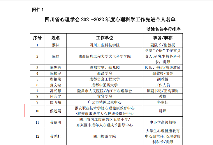 近日,四川省心理学会发布了2021-2022年度心理科学工作先进个人和先进集体名单,本次评选出了先进个人58名,先进集体27个,学院心理健康教育中心荣获先进集体,学院教师王可晖、侯述娟荣获先进个人。