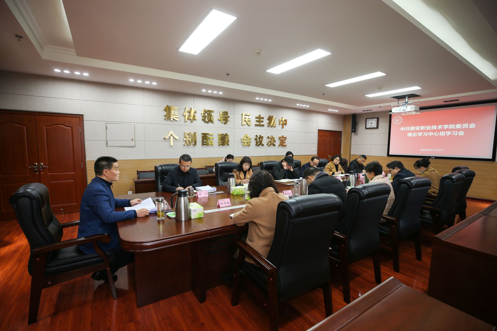1月15日上午,学院党委理论学习中心组在经开校区综合楼617会议室召开2024年第一次集体学习,认真学习领会习近平总书记关于党的建设重要思想、关于严肃党内政治生活的重要论述、关于职业教育重要论述以及《中国共产党纪律处分条例》和《县以上党和国家机关党员领导干部民主生活会若干规定》等内容。学院党委书记李春模主持会议并讲话,学院全体党政班子成员参加学习。