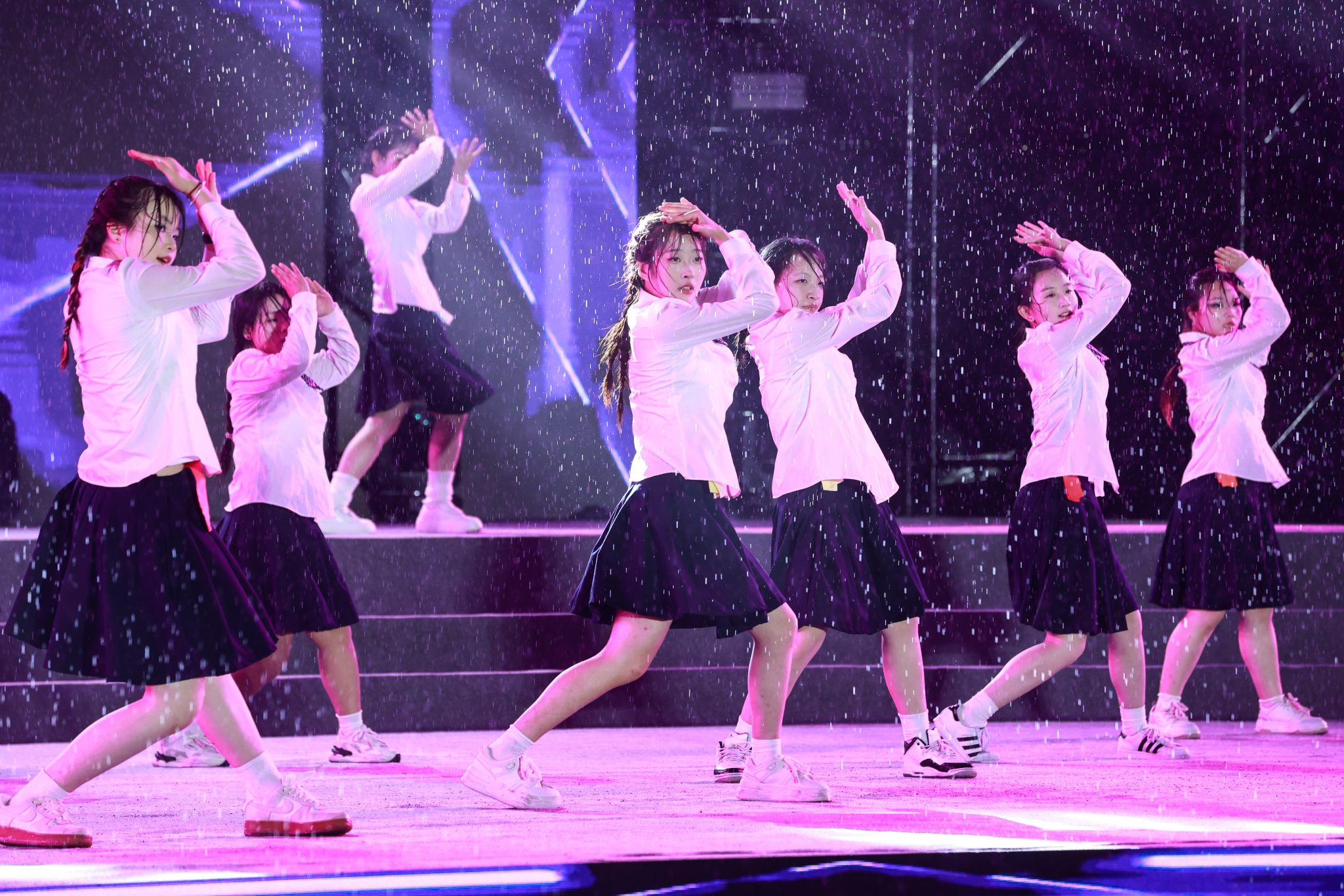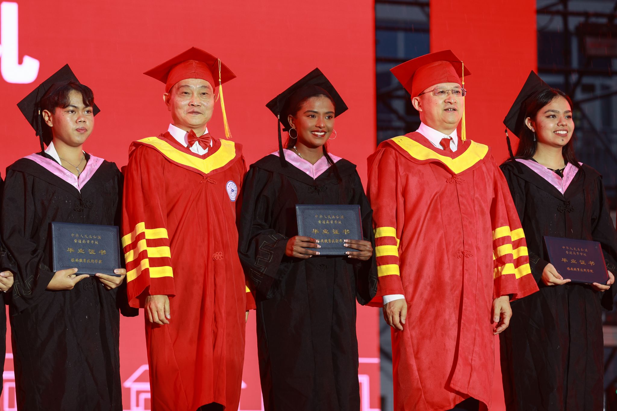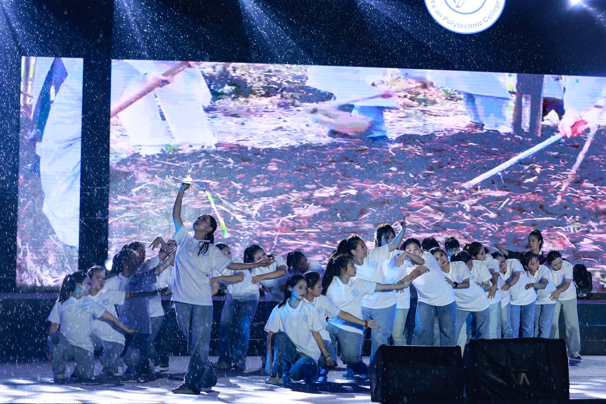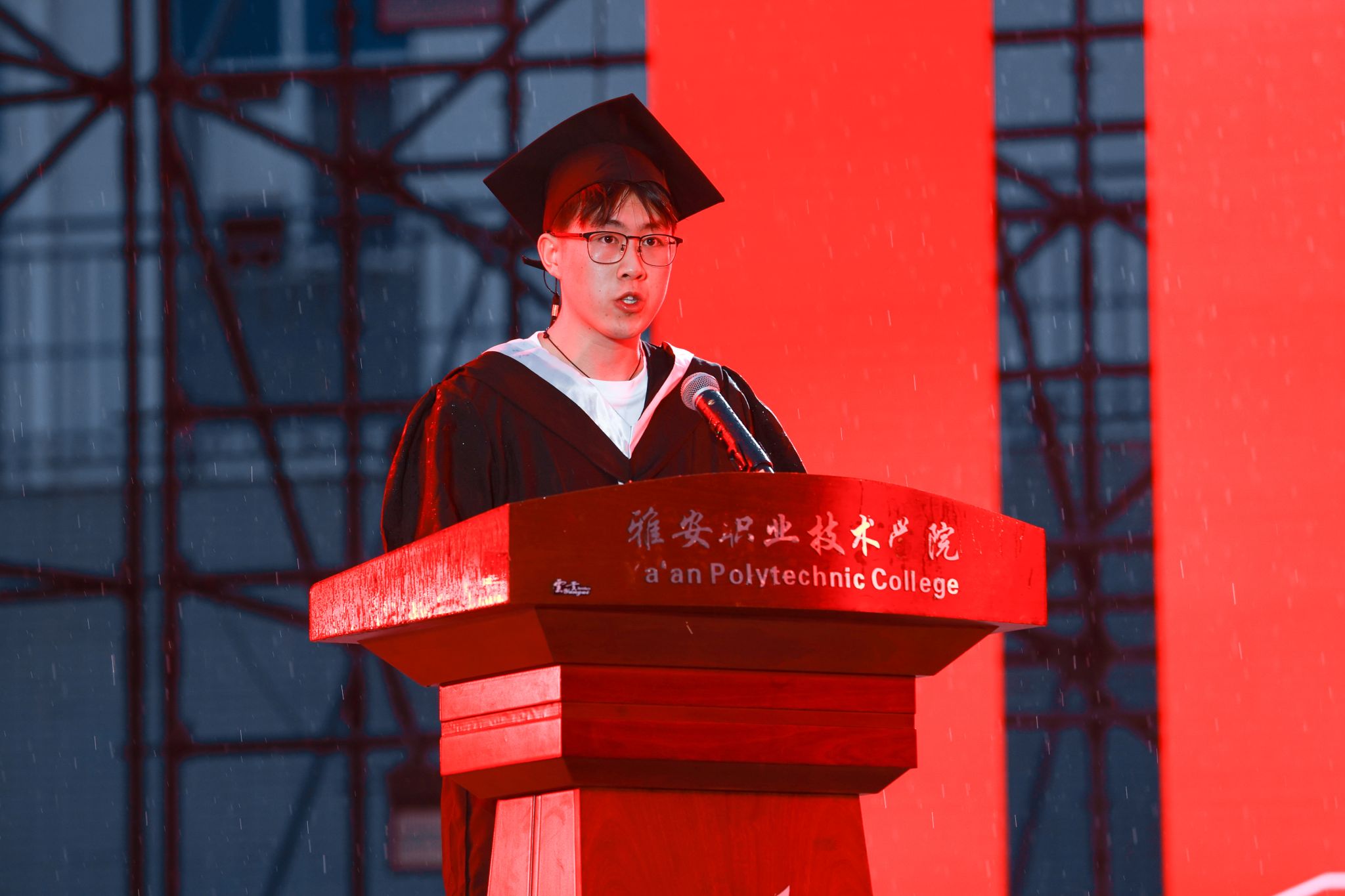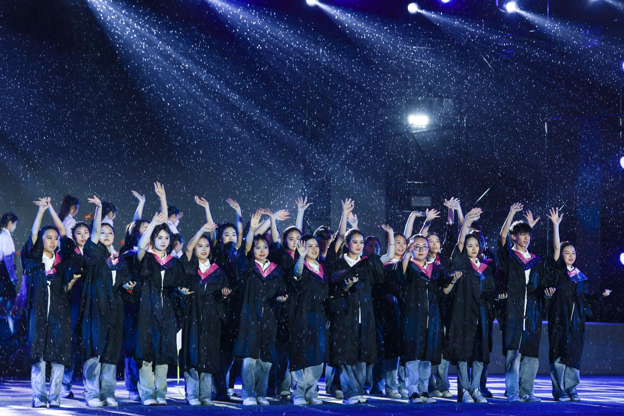 活动现场,一场大雨与典礼汇演不期而遇,全体师生始终坚持在原位,台上台下互动、风雨相伴,交加的风雨也吹不灭师生内心难舍的情谊。飘落的雨丝既像是同学们毕业远行感恩不舍的温情诉说,似乎也是对他们开启人生新征程的一场洗礼。相信这场雨中的青春盛宴定当镌刻在全体毕业生心中,激励他们怀揣母校的爱与祝福,昂首奔赴光辉灿烂的未来。