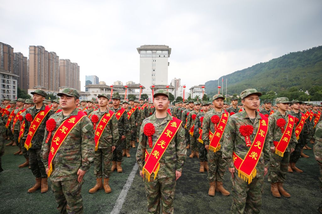 仪式现场,准新兵们身着戎装、肩披绶带,整齐列队、意气风发,齐声唱响《中华人民共和国国歌》,歌声中饱含着对祖国的赤子之心以及对未来军旅生活的憧憬与向往。