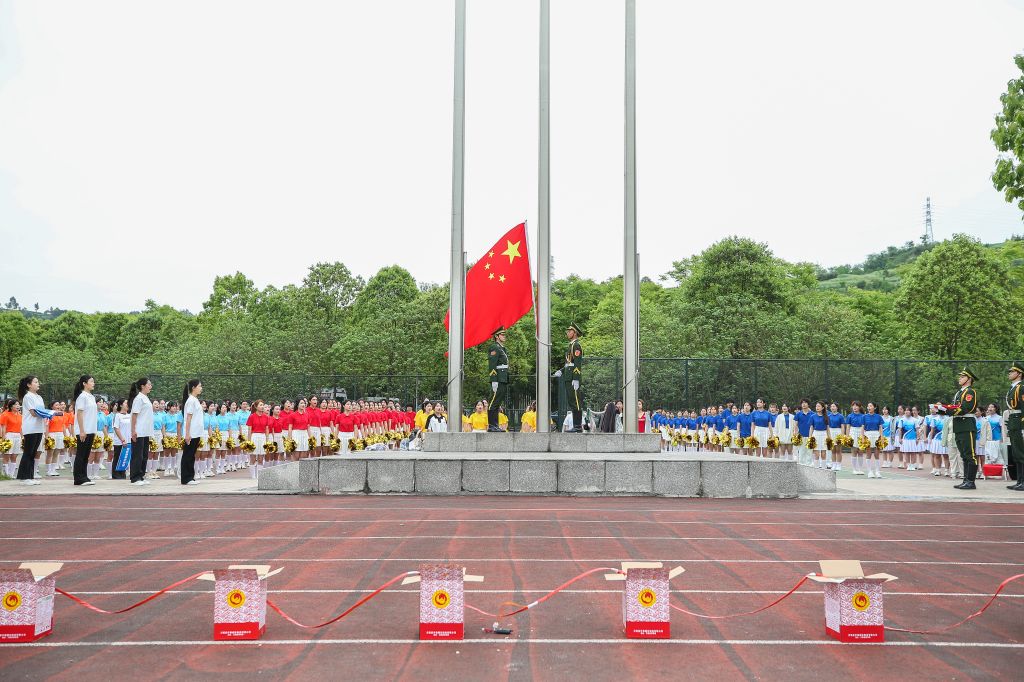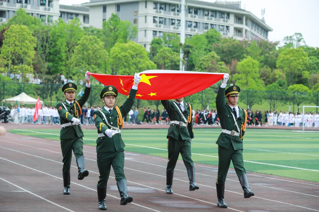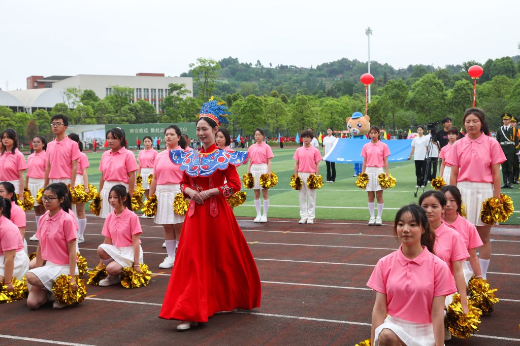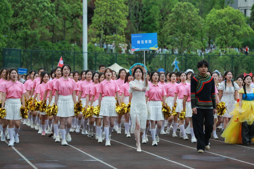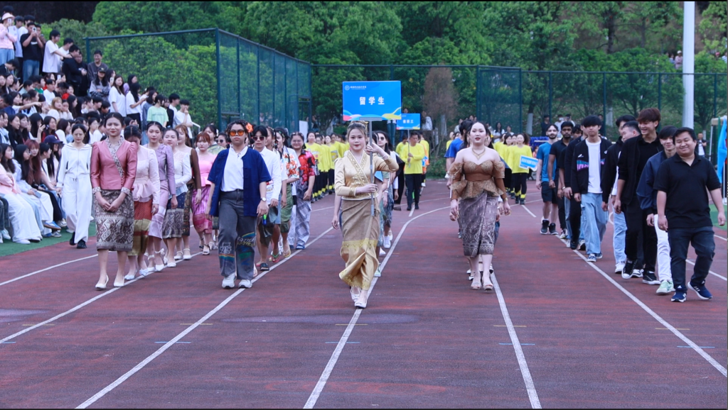 上午9时,国旗护卫队成员擎着五星红旗踏着铿锵正步入场,校旗方队、彩旗方阵、各二级学院方阵、留学生方阵和教职工代表等11个方阵昂首阔步走过主席台。各二级学院方阵以独具匠心的专业元素装点行进队伍,响亮激越的口号声久久回荡在操场上空。来自老挝、泰国、马尔代夫等国家的留学生身着传统服饰,用热情的歌舞为开幕式增添了一道靓丽的色彩,赢得广大师生的阵阵掌声。