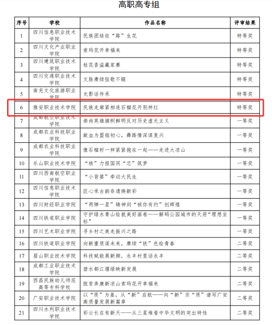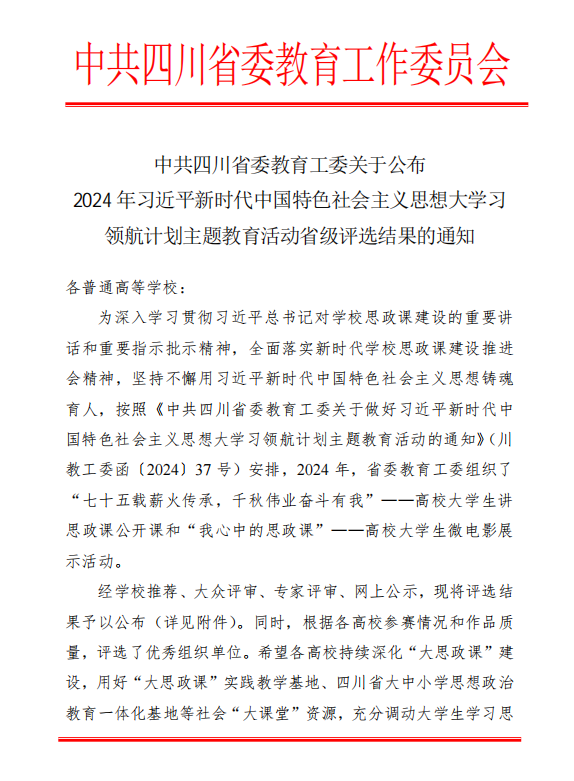近日,在四川省委教育工委公布的2024年习近平新时代中国特色社会主义思想大学习领航计划主题教育活动省级评选结果中,该作品再获省级特等奖。同期报送的廖雨潇、李月夏、任虹静老师指导的作品《以信仰伟力铸雪山忠魂》和胡梦玲、王坤容老师指导的作品《跩响千年花灯传承非遗文化》两个作品获得省级二等奖。