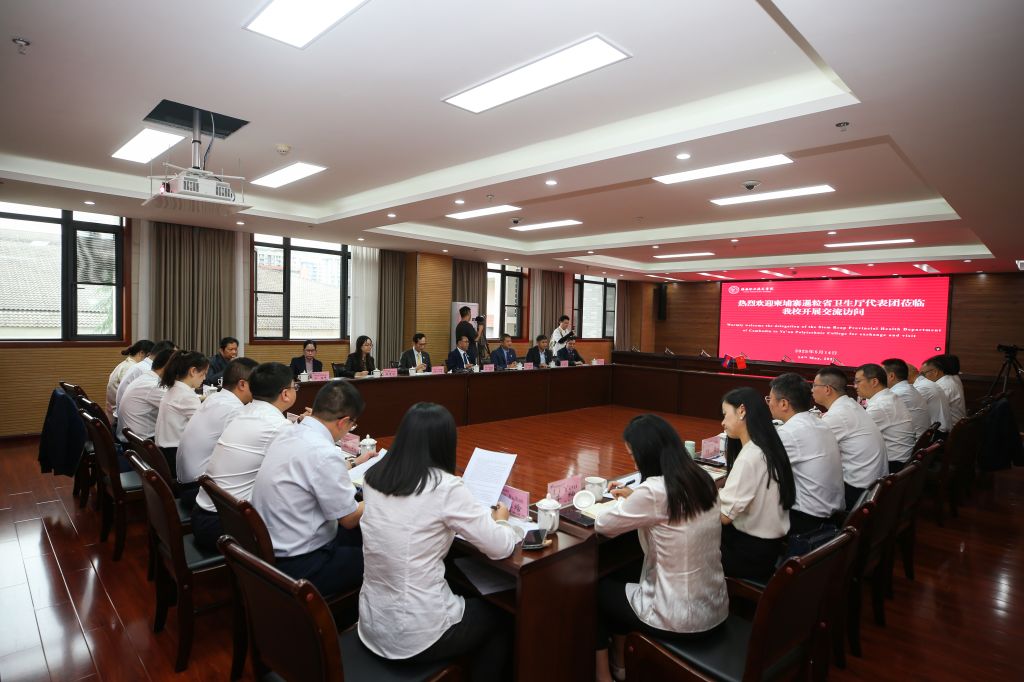 柬埔寨暹粒省卫生厅代表团8人,学校党委常委、副校长樊正康,雅安市经济合作和外事局党组成员、副局长张术洪,市融媒体中心副总编辑程普,学校教务处、继续教育与国际交流处、临床医学院(附属医院)、药学与检验学院、中医与康复养生学院相关负责人参加会议。