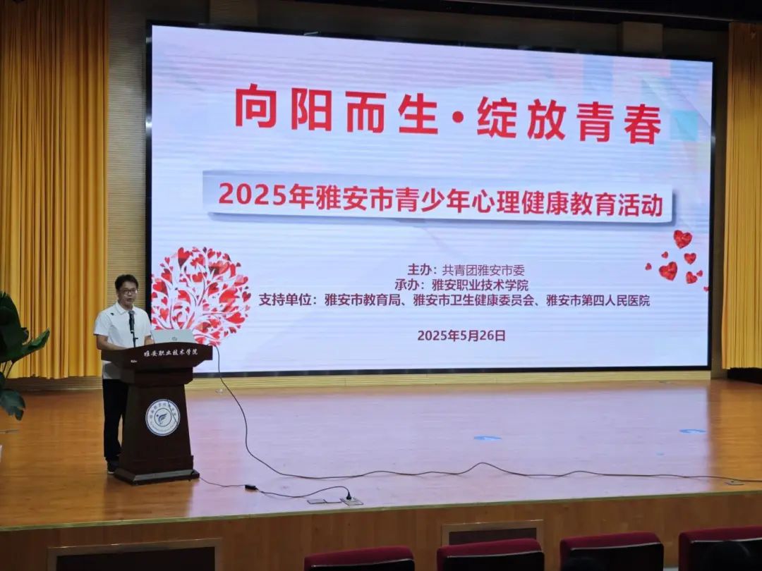 为深入贯彻落实习近平总书记关于加强学生心理健康教育工作的重要指示,进一步服务广大青少年健康成长,促进广大青少年身心全面和谐健康发展,5月26日,雅安市2025年“向阳而生·绽放青春”青少年心理健康教育活动在经开区校区举行。学校党委常委、副校长陈冬冬,团市委书记赵野逸,市教育局、市卫健委的相关负责人出席活动,来自学校、医院的30名心理健康教育从业人员及270名学生代表参加活动。