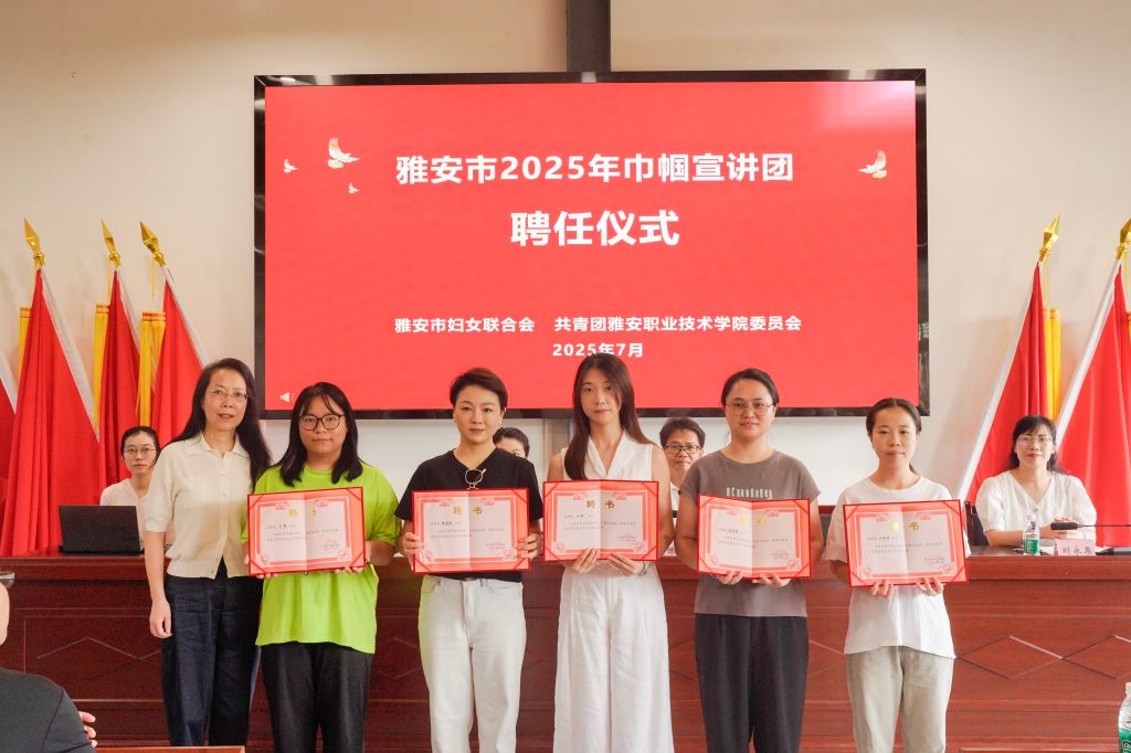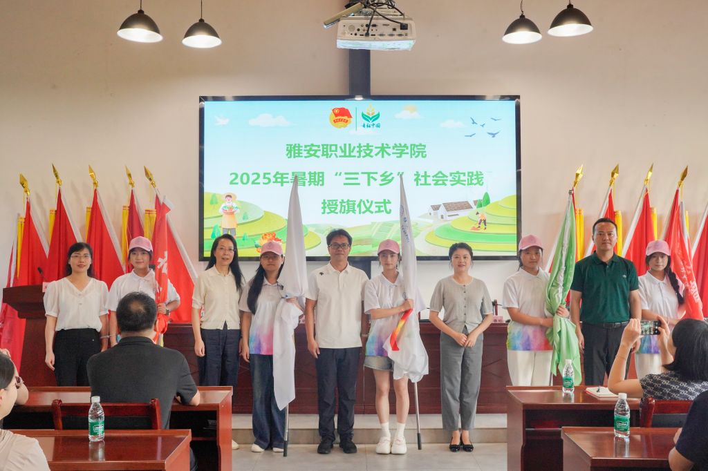 仪式上,与会领导为PP电子乡村振兴电商直播实践基地授牌,为雅安市巾帼宣讲团成员颁发聘书,并为四支重点实践团队授旗。学校重点实践团队志愿者伍益作为学生代表发言。陈冬冬郑重宣布学校2025年大学生暑期“三下乡”社会实践活动正式出征。