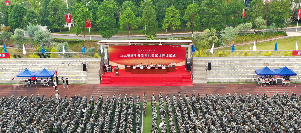 9月15日上午, 2025级新生开学典礼暨军训开训仪式在经开区校区、青年路校区操场同时举行。受学校党委书记李春模,党委副书记、校长黄诚委托,党委副书记杨洪媛和党委常委、副校长樊先茂分别为2025级新生开讲“开学第一课”,并为军训团授军训旗并宣布开训。党委常委、副校长樊正康、陈冬冬分校区主持仪式。
