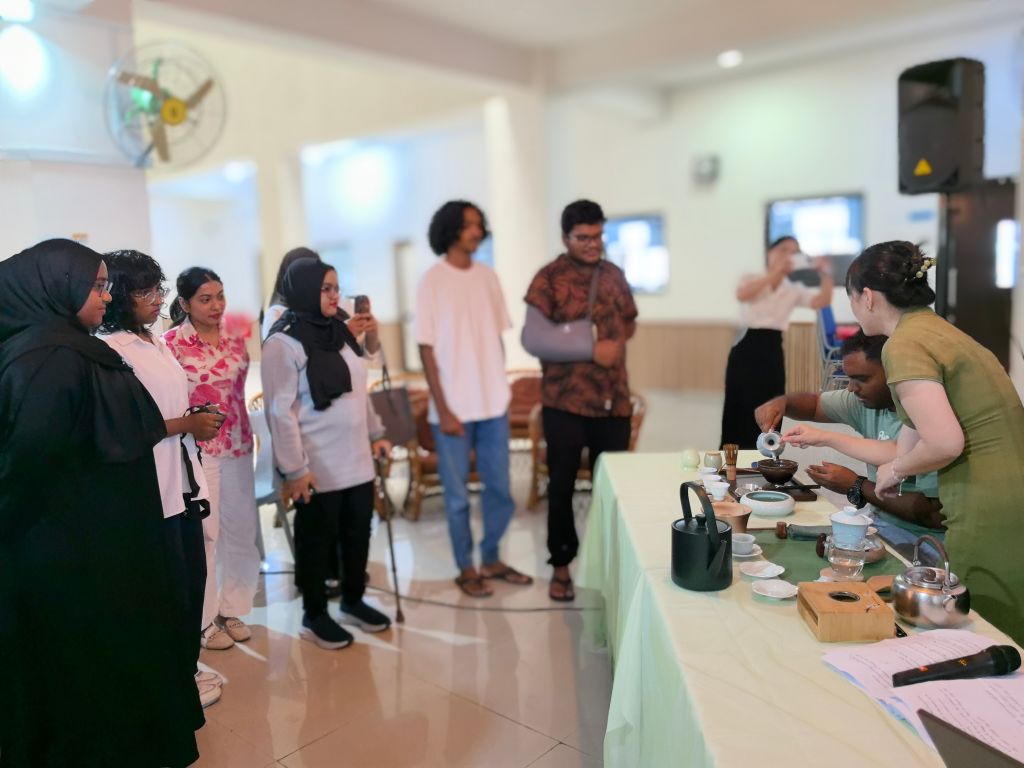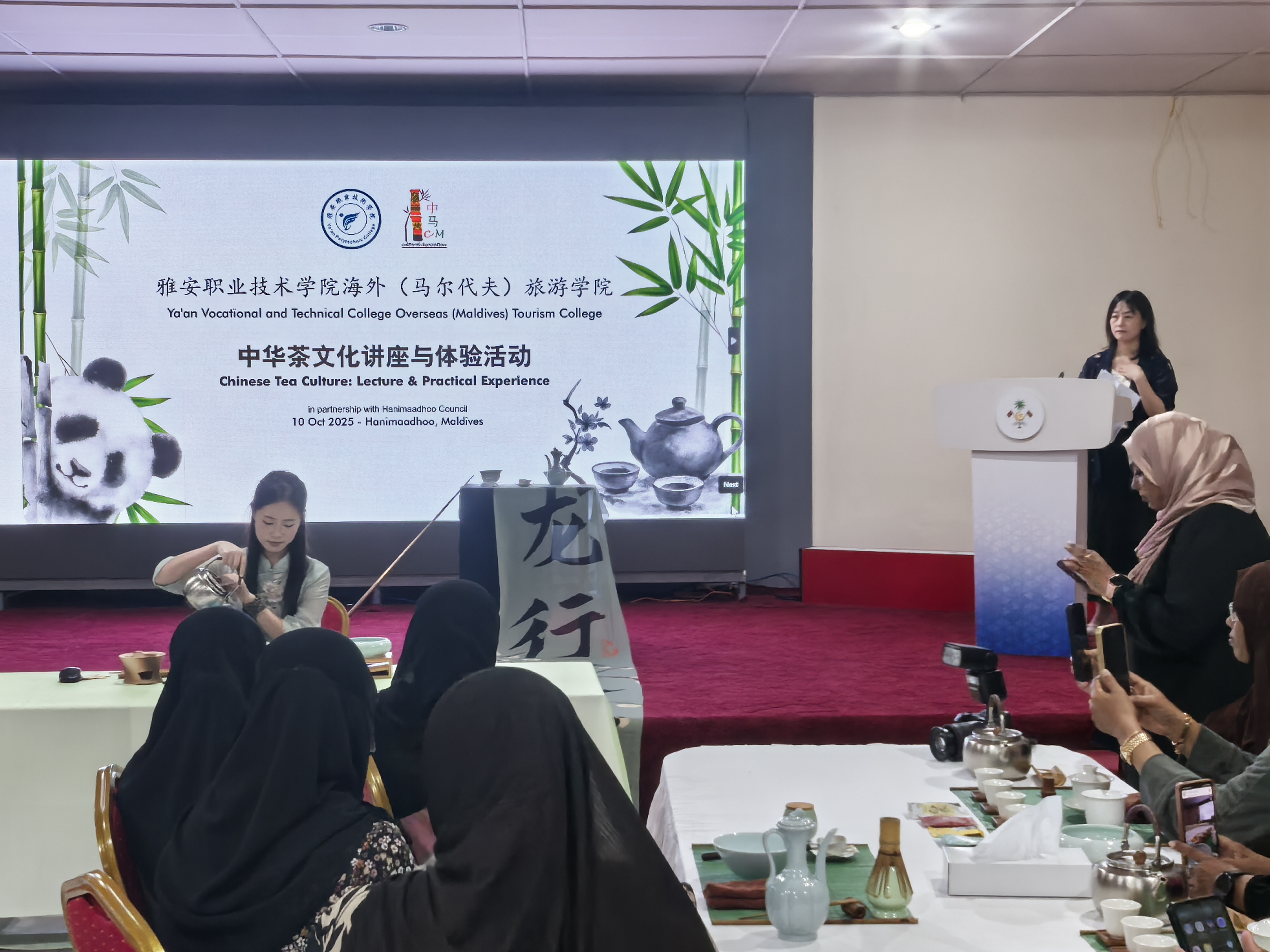 在马尔代夫国立大学,代表团与该校旅游管理学院质量主管阿米娜特・希亚玛等负责人,在学生实训基地就国际化旅游人才培养展开研讨。在国立大学学生活动中心,国家一级茶艺技师任敏教授为师生代表开展了《中国茶品鉴与茶艺鉴赏文化》主题讲座,系统介绍六大茶系与茶道内涵。李仪莹展示了中国盖碗茶技艺、长嘴壶“龙行十八式”,并现场培训,师生进行了沉浸式体验,激发了对中华茶文化的兴趣。