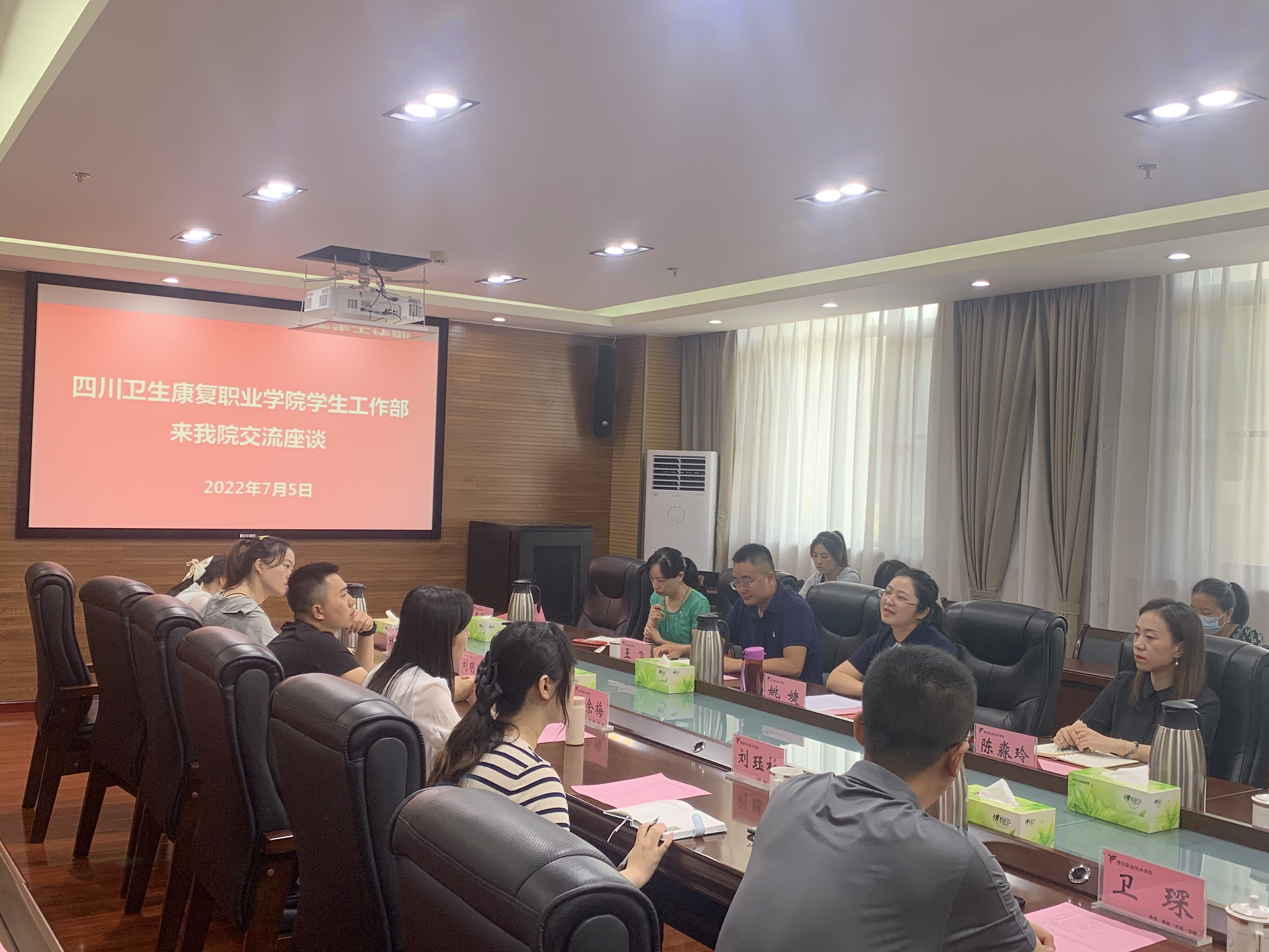 7月5日,四川卫生康复职业学院学生工作部部长陈余梅一行十五人到我院交流学生管理工作,交流座谈会在经开校区综合楼303会议室举行。学院学生处处长姚婕、副处长及学生处工作人员,部分二级学院副书记以及辅导员代表共计30余人参加会议。会议由姚婕主持。