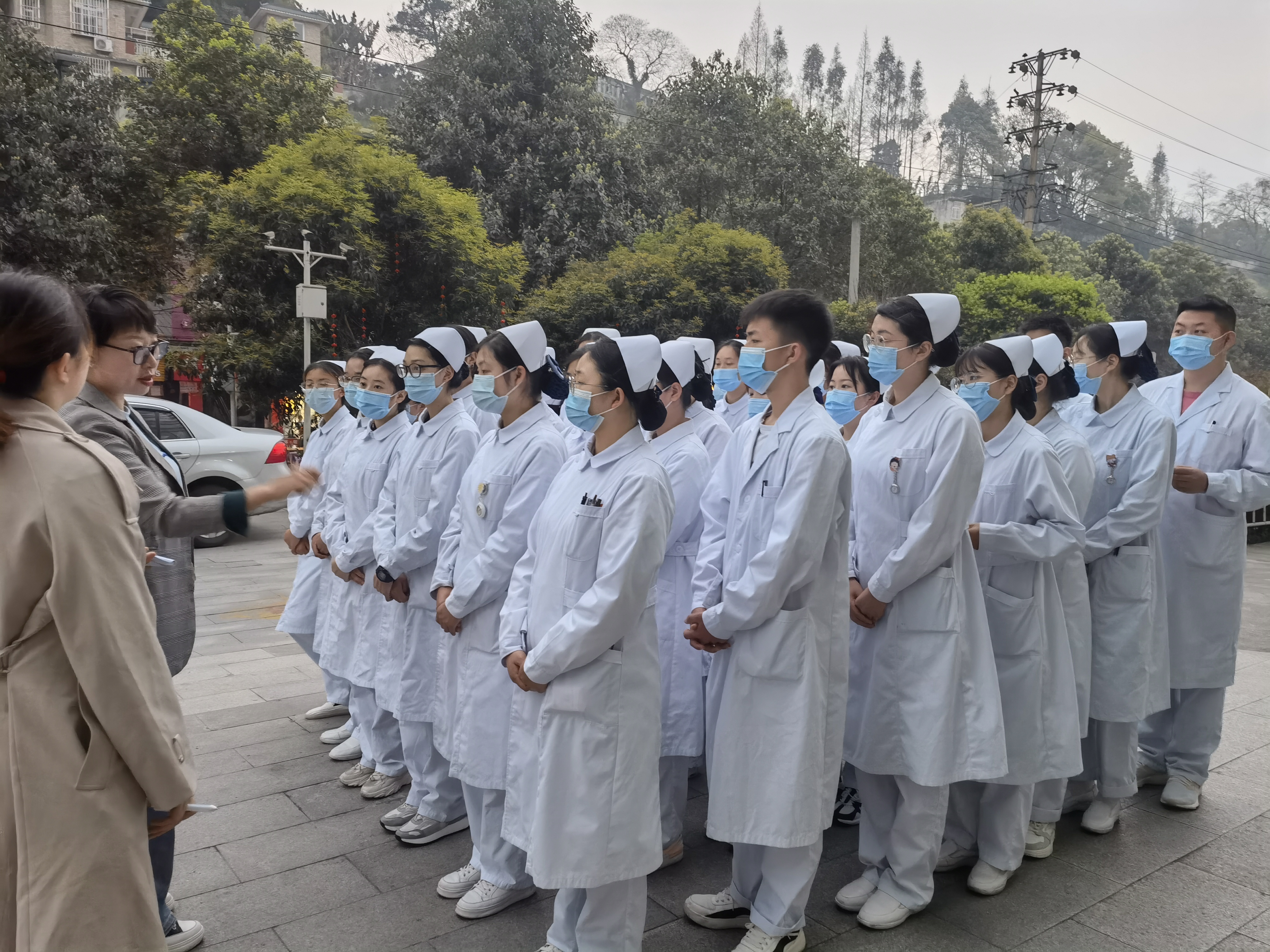 学院在廖林梅老师的带领下穿戴整齐前往市医院,市医院护理部副主任周昀霞表示热烈的欢迎,她向实习生们对医院的情况做了详细介绍,并就临床学习中着装规范、人身财产安全、职业防护等内容提出了要求,她希望同学们能认真学习,尊敬师长、勤学善思、尽快融入。随后,订单班的成员进行了人员编排,分别进入各个科室。