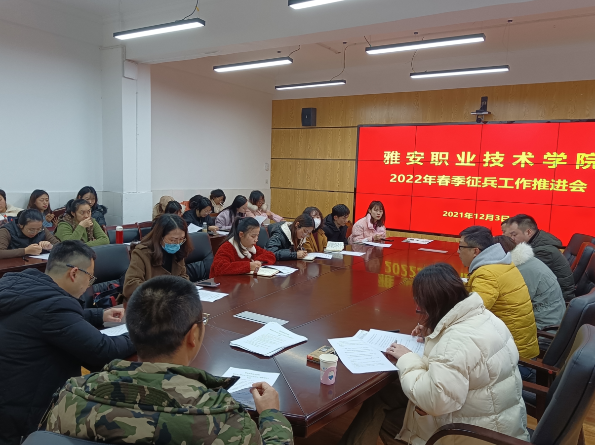 会上,徐维对2021年征兵工作情况做了总结,并根据四川省人民政府征兵办公室印发的《关于进一步激励大学生应征入伍的措施》和教育厅印发《四川省普通高等学校征兵工作实施细则》等通知要求,安排部署了2022年春季征兵工作,提出要充分认识征兵工作的重要性,增强责任感,认真学习并严格执行上级有关文件。同时要求辅导员要加大宣传力度,做好学生思想指导工作,积极为征兵工作创造有利条件,全力做好我院2022年春季征兵准备工作。