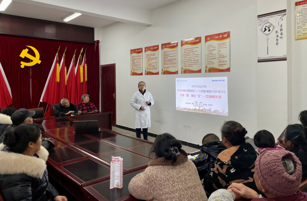 为了迎接世界艾滋病日的来临,进一步宣传和普及健康保健知识,增强社区民众对艾滋病等疾病的认识,减少疾病传播,11月30日,药学与检验学院阳光关爱志愿服务队10名志愿者在药检学院团总支书记鲜敏,专业指导老师林浩、李飞,党员教师马春兰的带领下前往雅安市荥经县宝峰彝族乡莲池村、新添镇上坝村、石龙村开展健康知识进社区科普宣传活动。