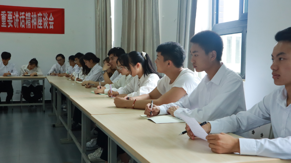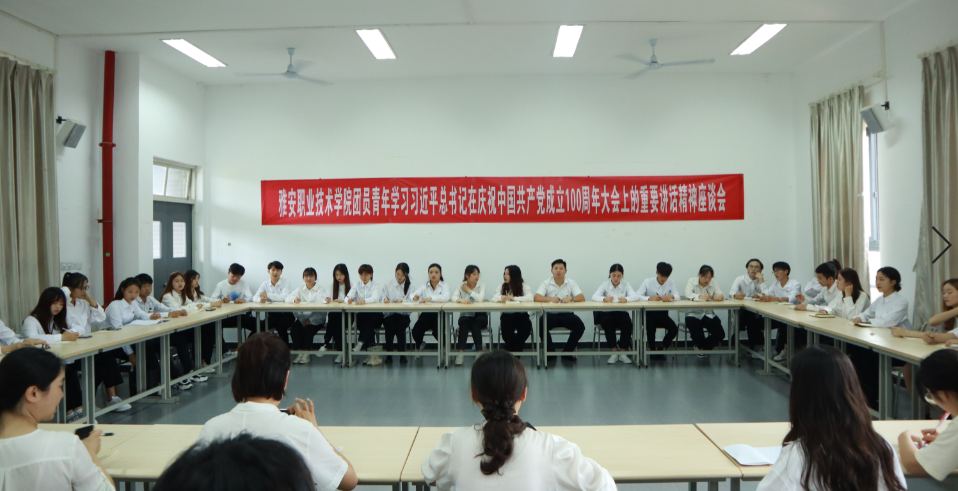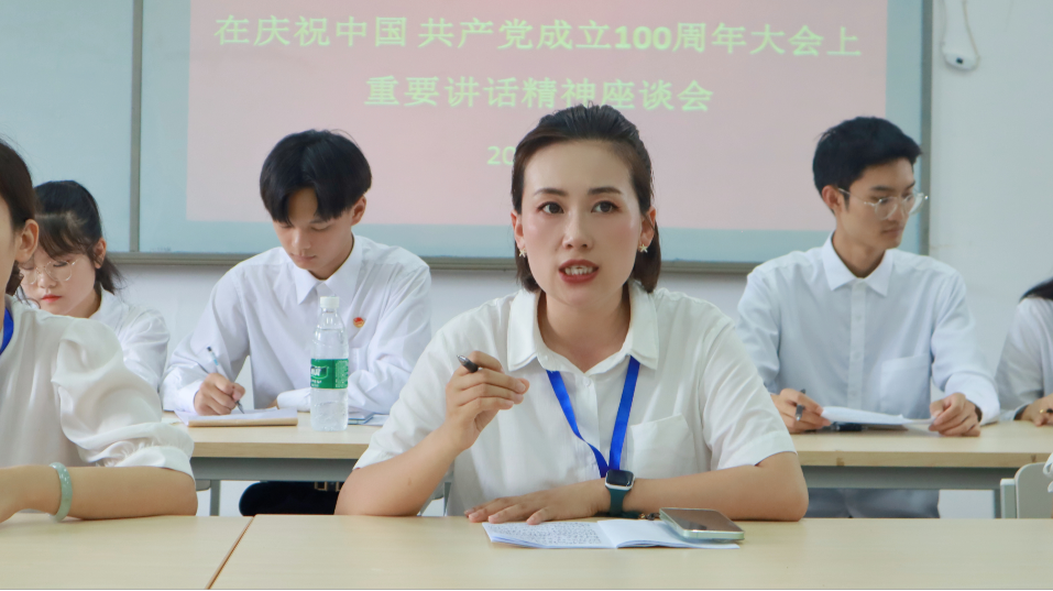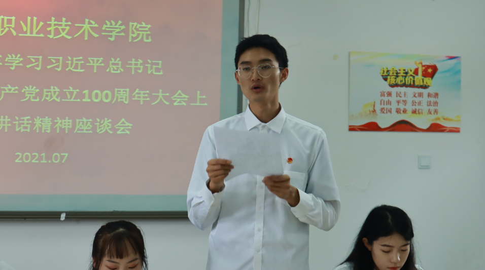 7月9日,院团委组织召开团员青年学习习近平总书记在庆祝中国共产党成立100周年大会上的重要讲话精神座谈会,来自各二级学院“两红两优”代表、学生会干部等50余名优秀团员青年参与座谈,院团委副书记叶芋伶、郭庆出席座谈会。
