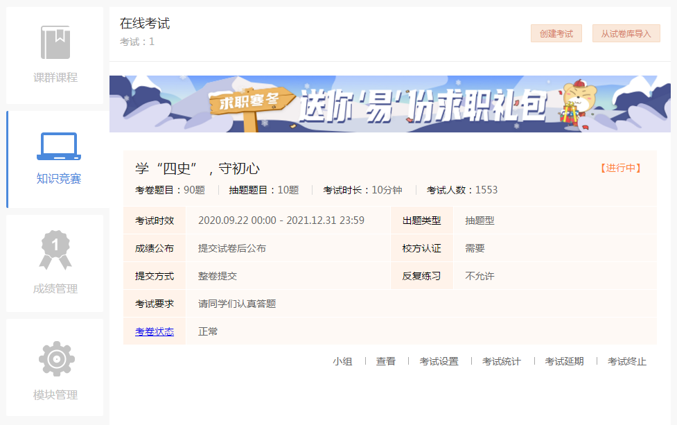 易班优课平台“学四史、守初心”学习打卡活动共有3704名学生参与,在学生中掀起了学习四史的热潮。截止6月15日,有264名学生取得了100分的优异成绩。活动评选出20名学习标兵,其中师范学院9人、护理学院7人、临床医学院2人、药学与检验学院1人、中医与康复养生学院1人,护理学院获得本项活动优秀组织奖。学习打卡活动以赛助学、以赛促学,激发了学生们的学习热情和动力。