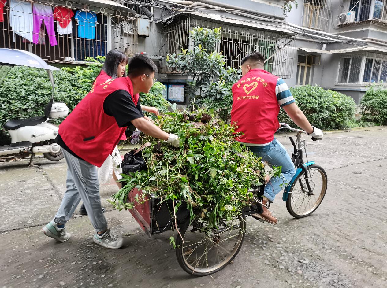 在爱国苑小区,党员教师和志愿者们铲除草坪内的杂草、打扫院落、清理垃圾。大家分工协作、配合默契,经过1个半小时,小区环境焕然一新。
