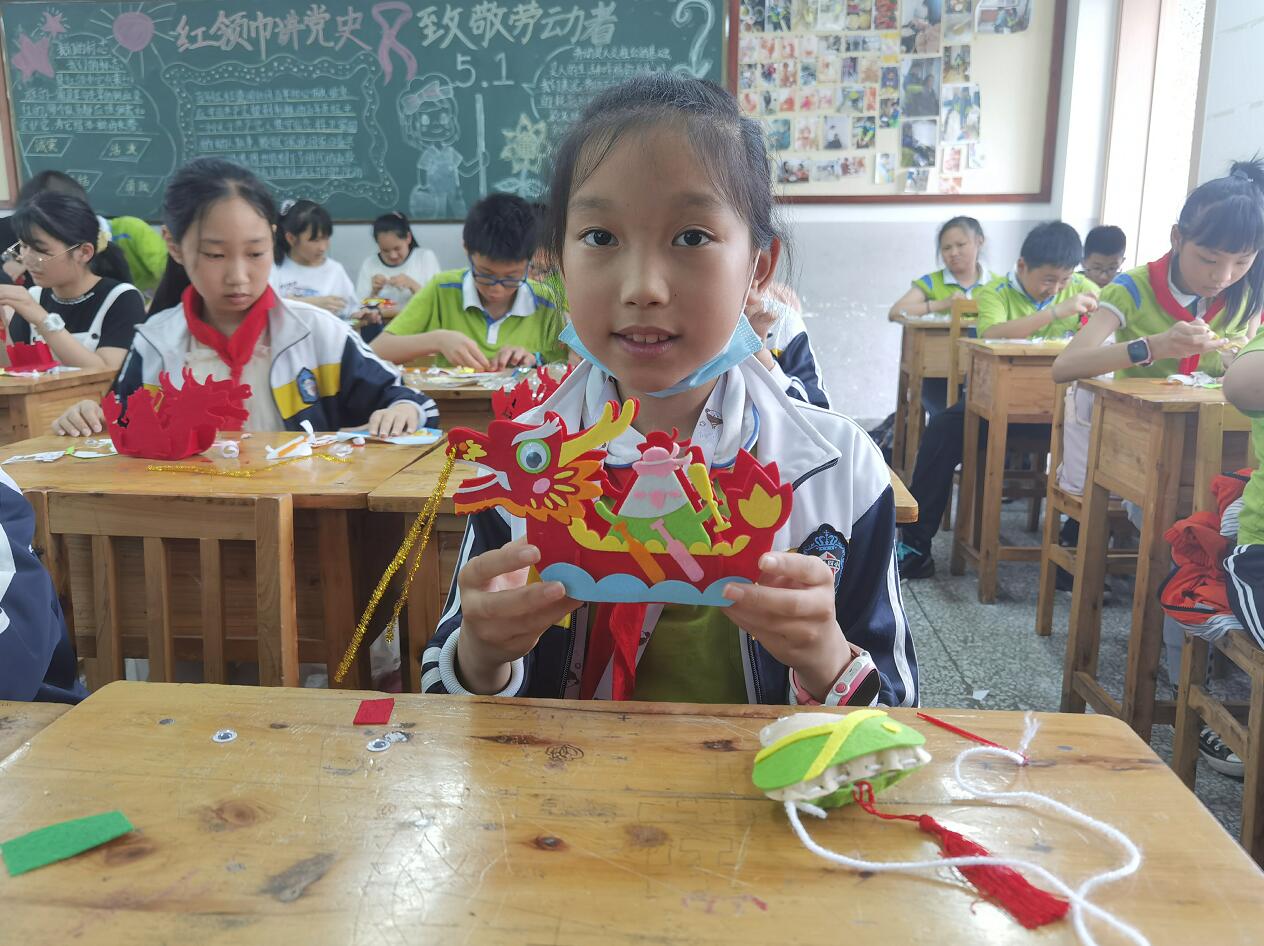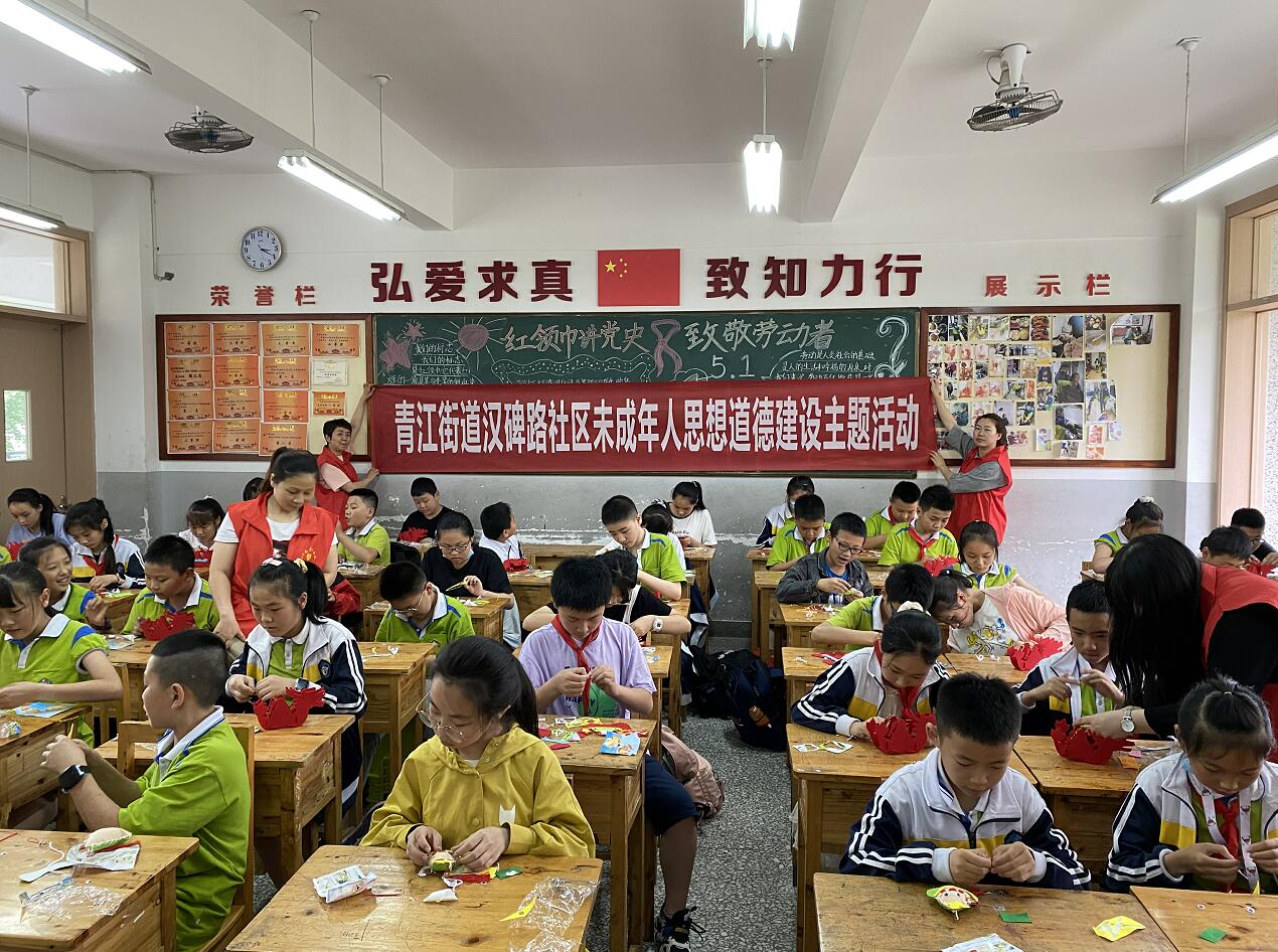 在爱国苑小区,党员志愿者们身穿志愿服、头戴志愿帽、手持劳动工具,重点对小区的垃圾、烟头、沿路落叶等认真进行了清理。志愿者们不怕脏、不怕累,积极发扬了奉献精神。经过一个多小时的劳动,小区面貌焕然一新,整洁有序,也受到社区工作者及小区居民的一致好评。在汉碑慈济小学,党员志愿者常恒老师为五年级四班的小朋友们深情讲述了爱国主义诗人屈原的故事和端午节的文化习俗。课后师生一道手工制作端午节龙舟和粽子挂件,将活动推向了高潮,为这个传统节日增添了喜气和活力。