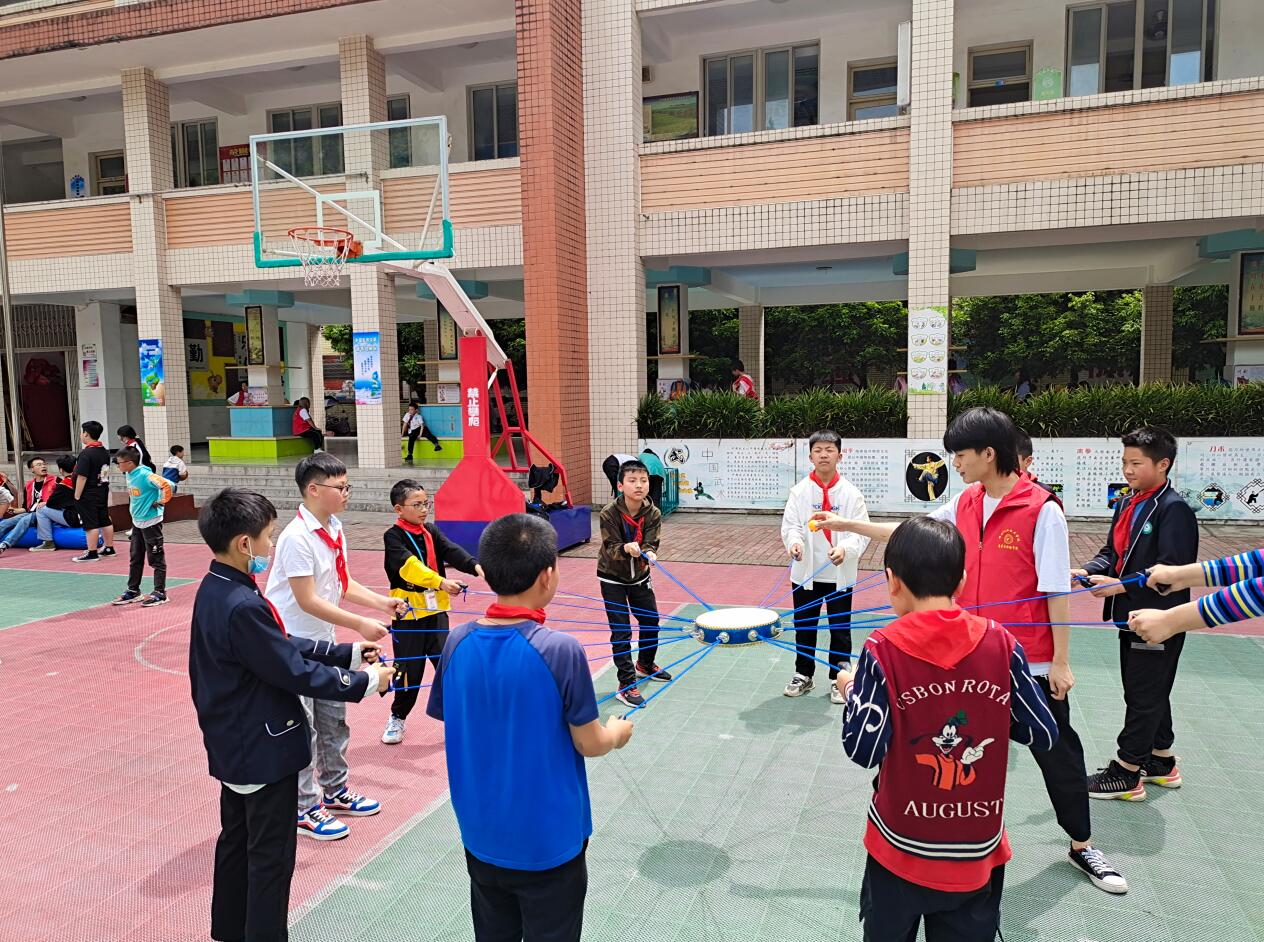 志愿者带上充足的活动物资布置好活动会场,在老师的引领下和六一班的同学们认识,做好了54名小朋友的游戏分组安排。在小朋友的欢呼与期待中,活动正式拉开了帷幕。热身舞蹈传承环节中,志愿者带领小朋友们一起学习《你笑起来真好看》的课间舞蹈,同学们虽然有些害羞但都认真学着。在“趣味游戏时间”环节,小朋友们按照分好的小组进行“齐心协力同心鼓”和“疯狂毛毛虫的比赛”,志愿者们做好记分、安全保障等后勤工作,不论头顶的太阳有多烈,每个志愿者都恪尽职守。游戏放松时间结束后,志愿者们也分组和小朋友们谈心闲聊,了解他们近期的困扰、压力,对小朋友进行宽慰、指导,帮助他们减轻心理负担,用真诚的心帮大家加油鼓劲。