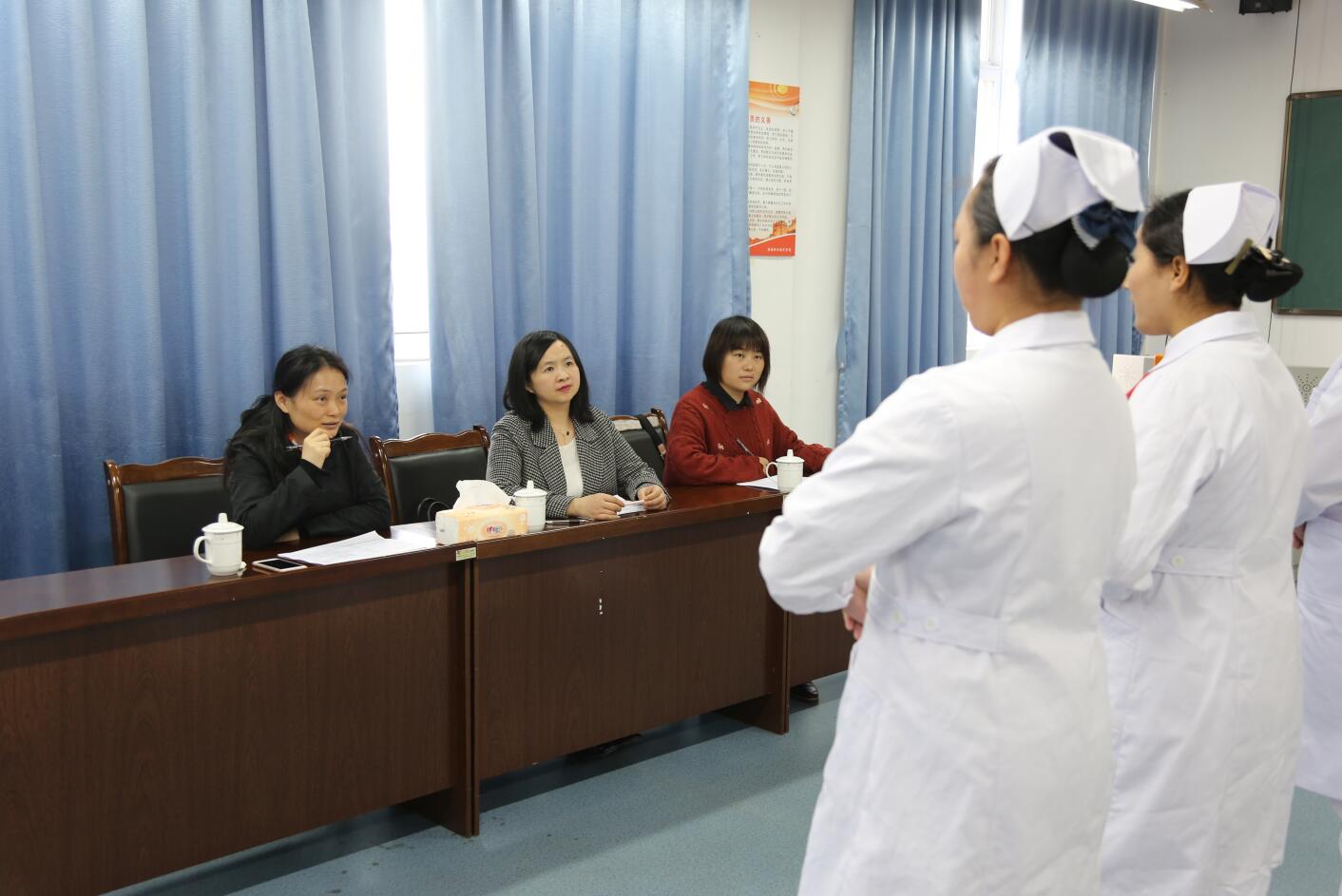 4月15日,成都市妇女儿童中心医院来我院青年路校区实训楼607教室进行实习生选拔,医院护理部副主任李慧敏、儿童神经内科护士长林振秀、儿童呼吸内科护士长黄园园担任面试官。本次面试共47名同学参加。
