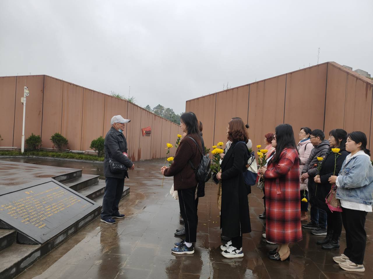 思政部直属党支部全体党员、教师来到名山百丈关遗址,在红军百丈关战役烈士纪念碑前献花,并邀请名山区优秀教育工作者聂金福给大家讲授关于百丈关战役的微党课,全体党员、教师重温了历史记忆,感慨中国革命的伟大。随后,全体党员、教师来到烈士陵园列队,向红军烈士默哀致敬,并献上菊花寄托哀思。