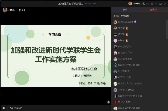为响应共青团中央《加强和改进新时代学联学生会工作实施方案》,提高社会认可度和同学满意度,临床医学院学生会和青志协在团总支书记张晓惜的安排下分别于1月30日、31日开展线上学习活动,学生会、青志协100余名同学参加会议。