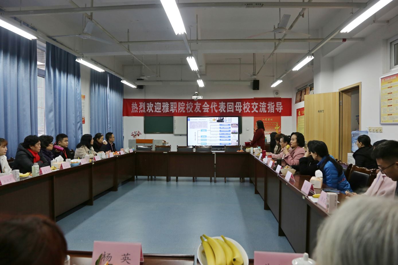 12月5日下午,护理学院校友参观了护理实训室,随后在青年路校区实训楼607举行“情系雅职、分享成长、共谋发展”校友座谈会。学院院长王静、党总支书记姚婕、副院长李燕、副书记张翅,教师代表,学生代表,以及来自各年级各地的校友代表60余人参加座谈会。座谈会由学院院长王静主持。