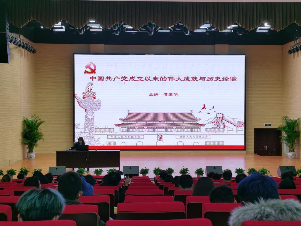 黄君华以“中国共产党成立以来的伟大成就与历史经验”为主题,图文并茂地为同学们讲述了新民主主义革命时期、社会主义革命和建设时期、改革开放和社会主义现代化建设新时期的关键人物、历史事件、指导方针等,通过回顾历史发展进程让同学们深刻感受到中国共产党的伟大成就,源自一直坚持着不忘初心,赢得民心,依靠核心,充满信心这“四心”鼎力前行。最后黄君华勉励同学们作为一名大学生学好专业知识和技能就是对“不忘初心”最好的实践和落实。