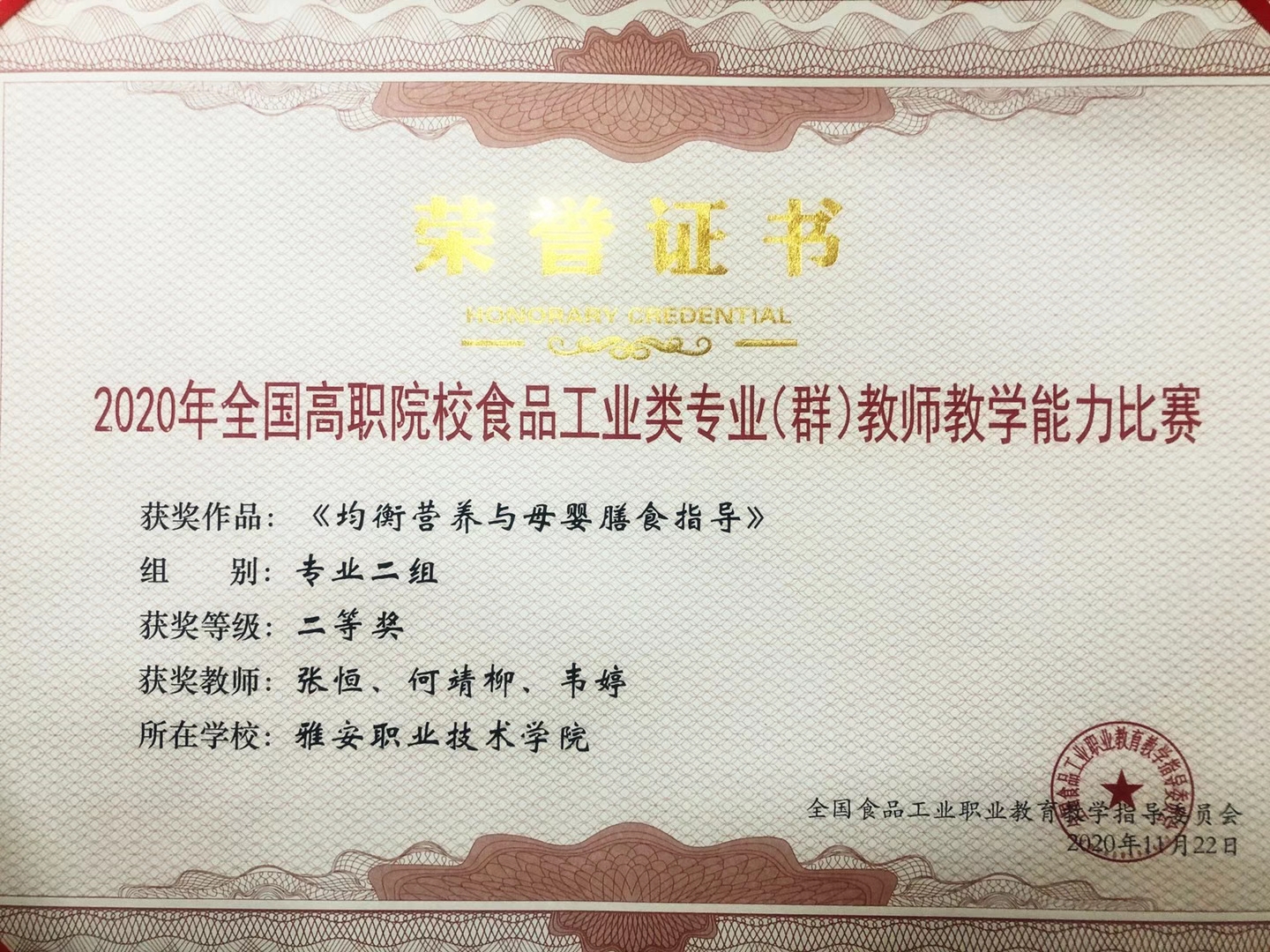 11月20日至22日,由全国食品工业职业教育教学指导委员会主办的“2020年全国高职院校食品工业类专业(群)教师教学能力比赛”现场决赛在山东商务职业学院顺利举行。经过激烈的角逐,药检学院张恒、何靖柳、韦婷教师团队合力打造的作品《均衡营养与母婴膳食指导》在专业二组比赛中脱颖而出,荣获二等奖。