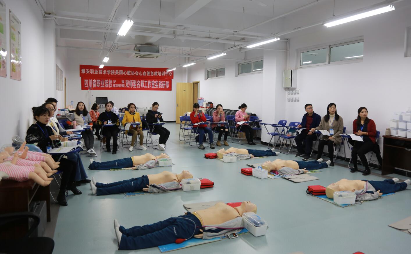 四川省职业院校“旅游管理”名师工作室成员范宗建、刘婷等10人在开班仪式结束后,来到学院AHA培训点,参加针对非医学专业人员开展的HS课程学习,护理名师工作室成员张雪庆等为旅游管理名师工作室成员授课,培训前旅游管理名师工作室成员谈到普及急救知识的重要性及必要性,希望通过本次培训提升自身急救水平,做到有能力、有勇气熟练地应用各种急救技能。