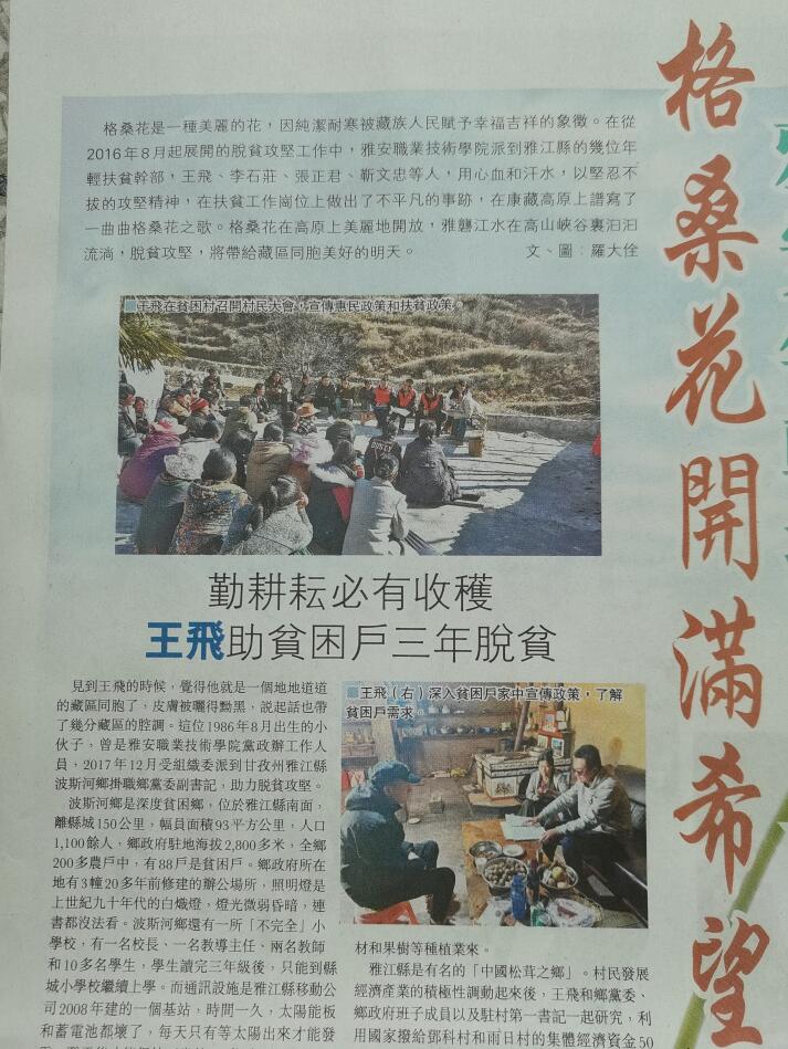 9月23日,《香港文汇报》(A17版)整版发表了学院图书馆馆长罗大佺的宣传PP电子游戏网站精准扶贫的报告文学《格桑花开满希望——雅安年轻扶贫干部情暖康藏高原》。该作品定位于国家脱贫攻坚的战略决策,生动描写了PP电子游戏网站干部王飞、李石庄等人用心血与汗水,在康藏高原的扶贫岗位上作出不平凡事迹,谱写出一曲曲格桑花之歌。作品感情真切而朴实,不仅表现了国家脱贫攻坚政策给当地带来的深刻变化,还有力地表现了PP电子游戏网站教师干部听从时代和国家召唤,勇于担当和奉献的精神风貌。
