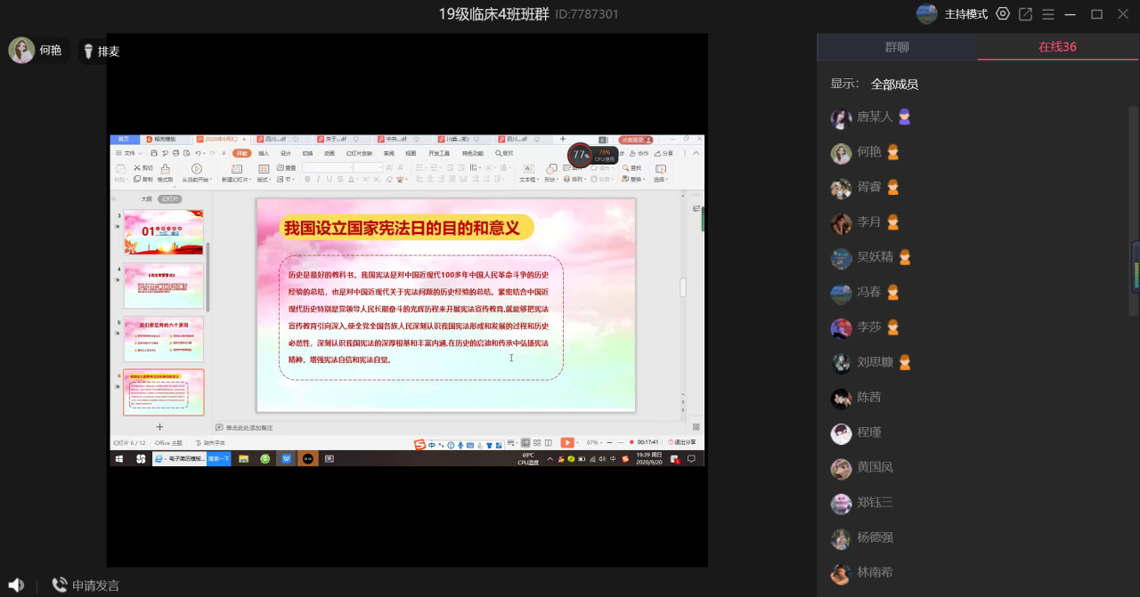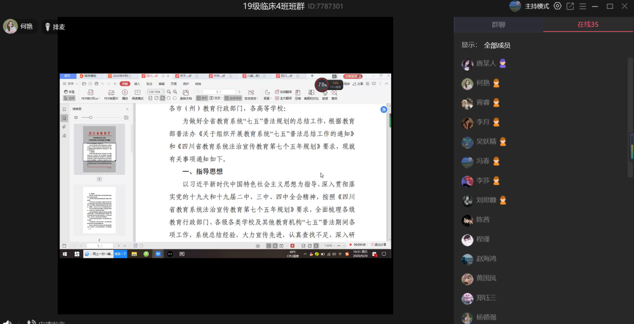 按照临床医学院团总支部署和统一要求,此次团日活动以“七五普法”为主题,临床医学院共计27个在校团支部利用课余时间,组织班级同学通过群会议、群课堂、群讨论等方式,在线学习法律知识,结合习近平总书记教育重要论述讲义和新时代爱国主义教育实施纲要,培养大学生遵纪守法、维护社会稳定与和谐的观念。“七五普法”融合于新时代爱国教育中,是大学生正确理解和坚持实行依法治国方略、建设社会主义法治国家的需要;是完善和优化大学生的知识结构,提高法律素质,将自己培养成“四有”人才的需要。