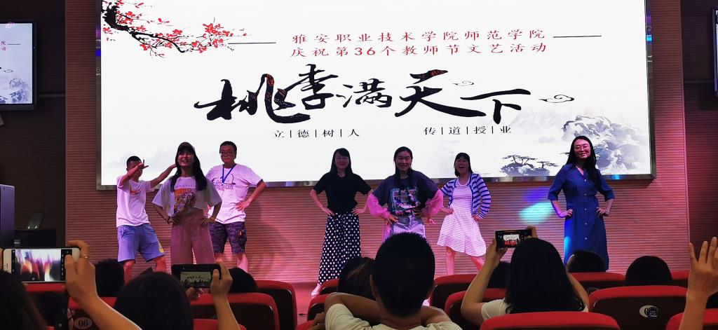 学前教育与特殊教育教研室带来了诗歌朗诵,张晓茹老师和蔡小龙老师以充沛饱满的感情赞颂了教师甘为人梯、无私奉献的精神。中文与传媒教研室全体教师深情演绎了歌曲《长大后我就成了你》, 歌声婉转悠扬,感人肺腑,道出了大家对教师这份职业的崇敬与热爱。英语教研室带来了歌曲串烧,青春洋溢的英语老师们在舞台上尽情唱跳,氛围轻松活泼,现场欢呼声不断。随后,数学教研室的黄正阳老师用竖笛演奏了四首经典曲目,让大家看到了一位平日里严谨的数学老师对音乐和生活的热爱。艺术教研室的老师们钢琴、古筝、尤克里里齐上阵,舞蹈“无价之姐”的表演掀起了全场活动的高潮。最后,办公室的辅导员老师们通过“你演我猜”的游戏调动起全体老师一同参与成语竞猜。整个现场气氛融洽,高潮迭起,笑声不断。