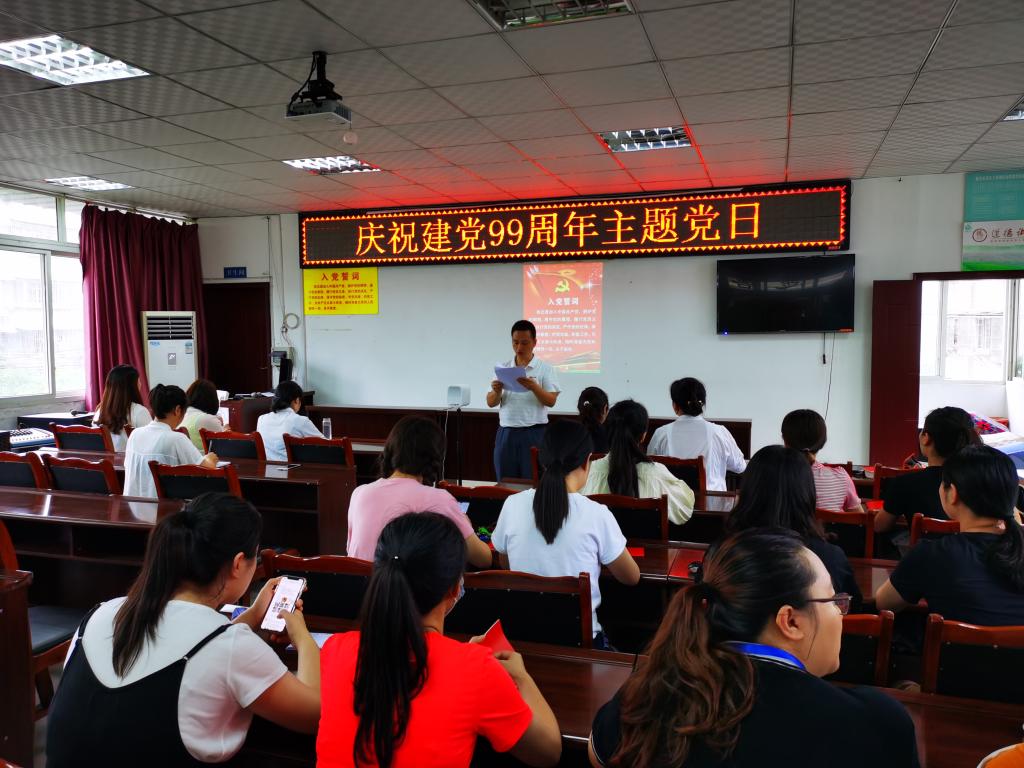 首先,由刘忠建传达《中共雅安市委组织部关于开展庆祝建党99周年活动的通知》文件精神,提出活动要求。随后,由姚婕领誓,带领新党员宣誓,老党员重温入党誓词。随后,姚婕、叶芋伶分别以“坚定信仰,做合格党员”“坚守党员初心,筑牢纪律防线”为主题给党员们上党课,进行理想信念和党规党纪教育。最后党员们结合童朝辉同志事迹进行讨论分享,大家纷纷表示要坚定理想信念,守住党员初心,立足岗位职责,积极主动作为,起好党员的先锋模范带头作用。