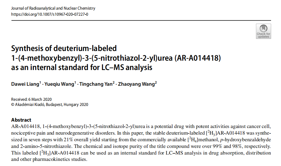 近日,我院药检学院副院长梁大伟在稳定同位素标记药物合成方面取得新进展,相关成果以题“Synthesis of deuterium-labeled 1-(4-methoxybenzyl)-3-(5-nitrothiazol-2-yl)urea (AR-A014418) as an internal standard for LC–MS analysis”发表于SCI刊物《Journal of Radioanalytical and Nuclear Chemistry》(DOI: 10.1007/s10967-020-07227-0)。PP电子游戏网站为论文第一单位,梁大伟教授为论文第一作者。