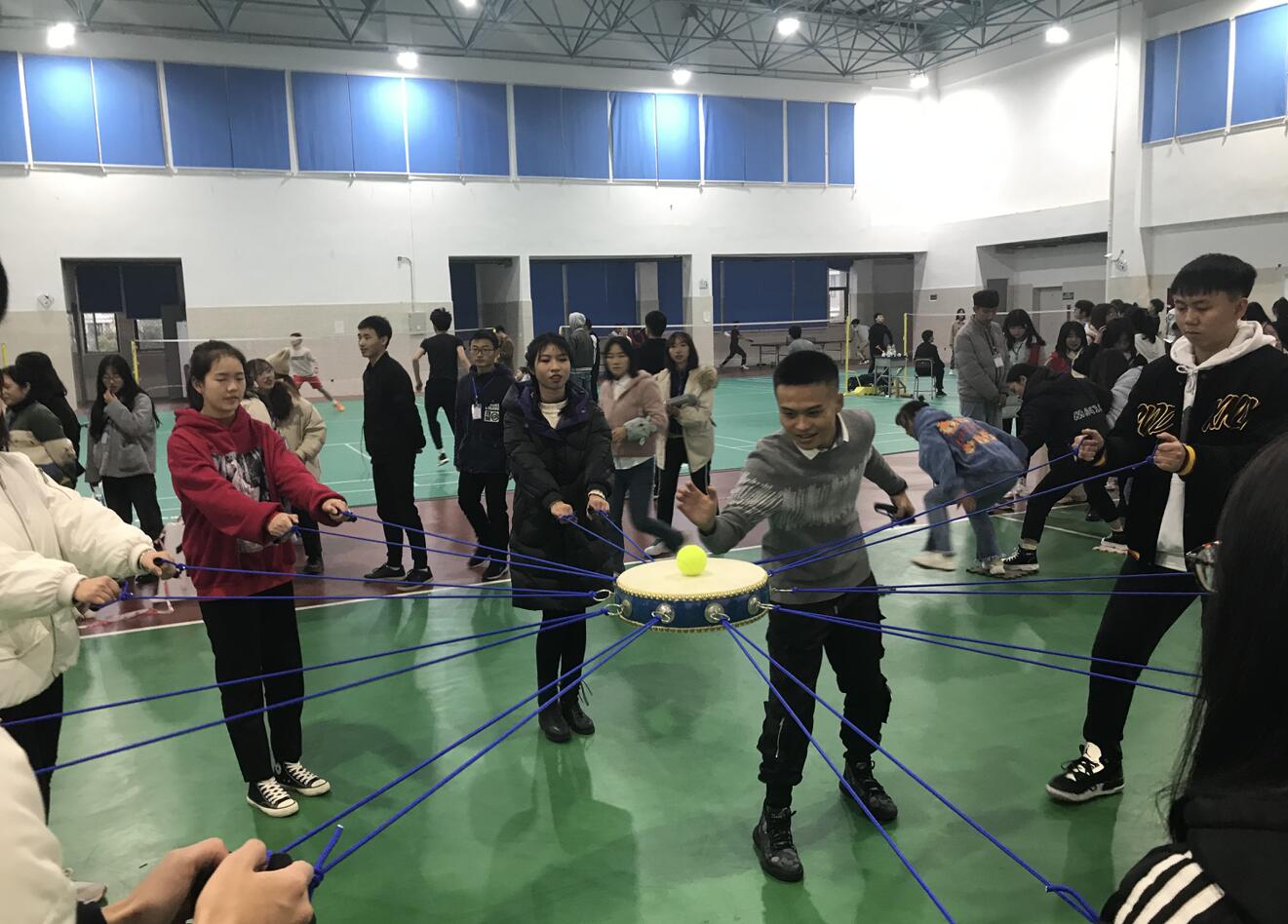 各参赛队伍到齐后,主持人巫晓龙、郭晓敏宣布运动会开始,他们对活动流程、场地划分、运动会期间的注意事项做了简要说明。文娱部的开场舞《what is love》点燃了现场的氛围,每个小组的成员都在自己商讨着战略计划,商量团队如何配合才能更加默契。14:30,比赛正式开始,一共4场比赛,包括乒乓运输、海底传月、仙人指路、铁甲战场、疯狂毛毛虫、摸石过河、搭桥过河、无间道、电臀抖球、同心鼓颠球、呼啦圈过山车、糖果传递等12个项目。参赛队员们齐心协力,用尽自己的洪荒之力,各拉拉队也不甘示弱,一个劲地呐喊助威,一时间加油喝彩声、欢乐喜笑声席卷了整个赛场,现场十分热闹。耐不住同学们的参赛热情,工作人员还开启了现场报名通道。