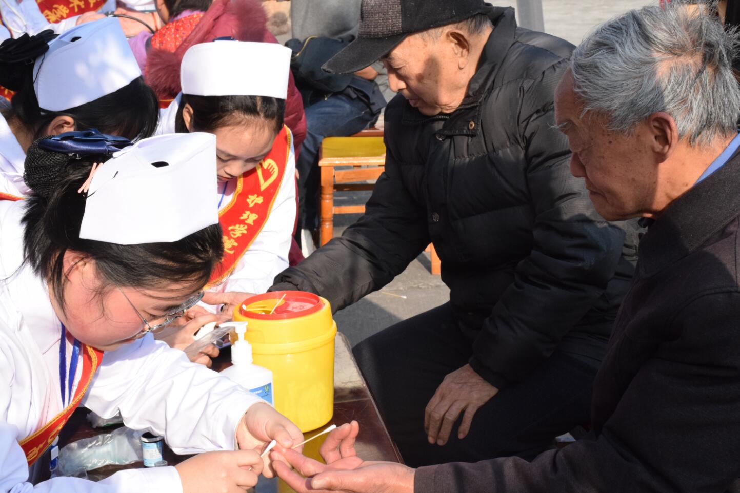 活动中,志愿者分工明确,一部分耐心解答居民提出的问题,提出合理化建议,一部分娴熟地为居民测量血糖血压,同时进行健康知识宣讲,分发《老年保健手册》。