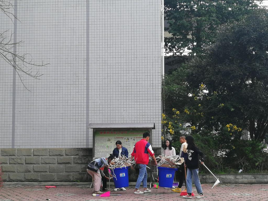 负责人清点人数分组、分发清洁用具,分别对教室和庭院开展清扫工作。由于不少教室的黑板上有长期循环使用导致黑板存在擦不干净的情况,一组志愿者们花费不少功夫将黑板清理干净,同时也将教室里的桌椅擦拭干净。另一组志愿者清扫庭院地上的落叶以及新生分发书籍留下的各种垃圾。最后,检查完教室以及庭院的卫生后,志愿者们来到图书楼门口合影留恋。