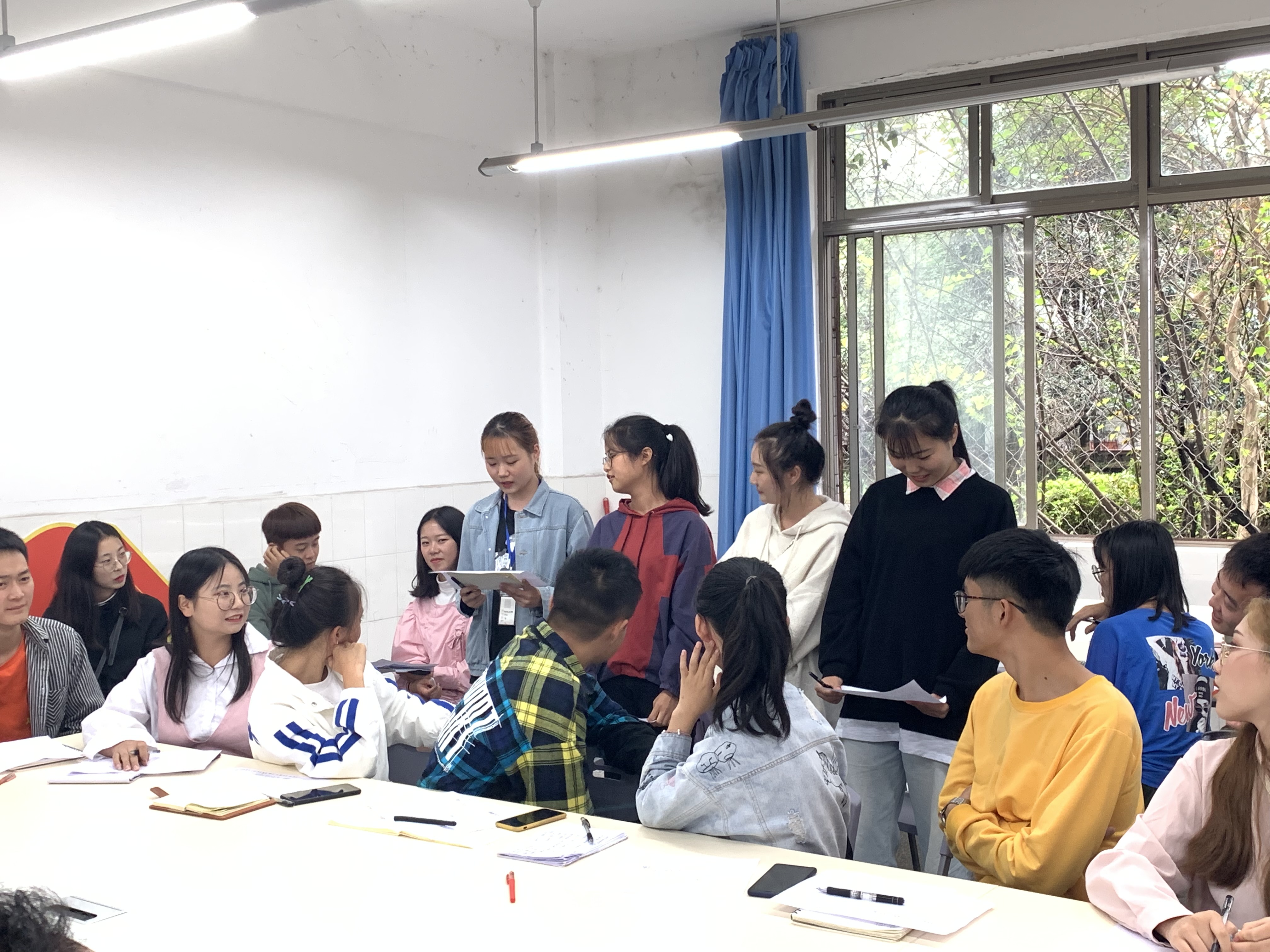 会议最后,刘永恩老师组织大家开展了一次“团建”活动,让大家在思考工作之后,用一句话总结前期工作的感受,并于身边的同伴进行分享,在得到同伴的一句话肯定后,增强了前行的动力。现场的老师和同学经过深入走心的交流后,老师们给出了“爱工作,带团队,让我来!”,全体同学学生干部给出了“任务给我,团队给我,请看我的!”郑重承诺。