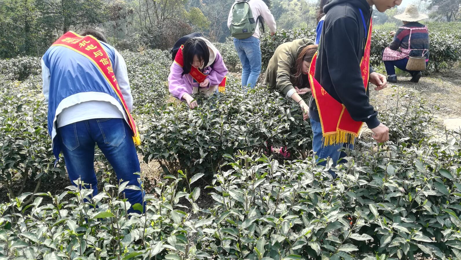 三月的春风拂面,雷锋精神永传承。2019年是毛泽东主席题词“向雷锋同志学习”发表56周年。为进一步弘扬雷锋精神,引导和激励广大学子积极践行社会主义核心价值观。3月29日,智信学院青年志愿者携手雅安市名山区永兴镇古房村困难茶农开展志愿服务进社区活动。茶山上的志愿者巧手飞舞,掐茶、提手采茶、收手放茶,一片忙碌,在茶山上勾勒出一幅和谐的田园画卷。