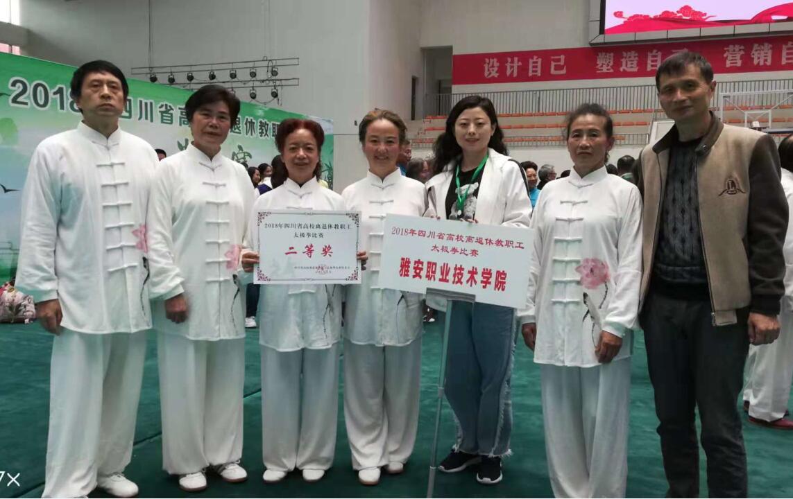 【本网讯】近日,2018年四川省高校离退休教职工太极拳比赛在成都中医药大学温江校区体育馆举行,此次比赛由四川省教育厅主办,成都中医药大学承办。来自全省12所高校代表队参加比赛,我院离退休教职工彭述芳、冯霞、李桂珍、张忆、刘培根、邵鹏辉、肖洪珍7位老同志组成的太极拳代表队参加了本次比赛。比赛场上,太极拳代表队的队员在比赛场上一招一式,整齐归一,刚柔并济,中正安舒。经过激烈角逐,我院代表队获得二等奖的好成绩,充分展示了我院退休教职工良好的精神面貌。
