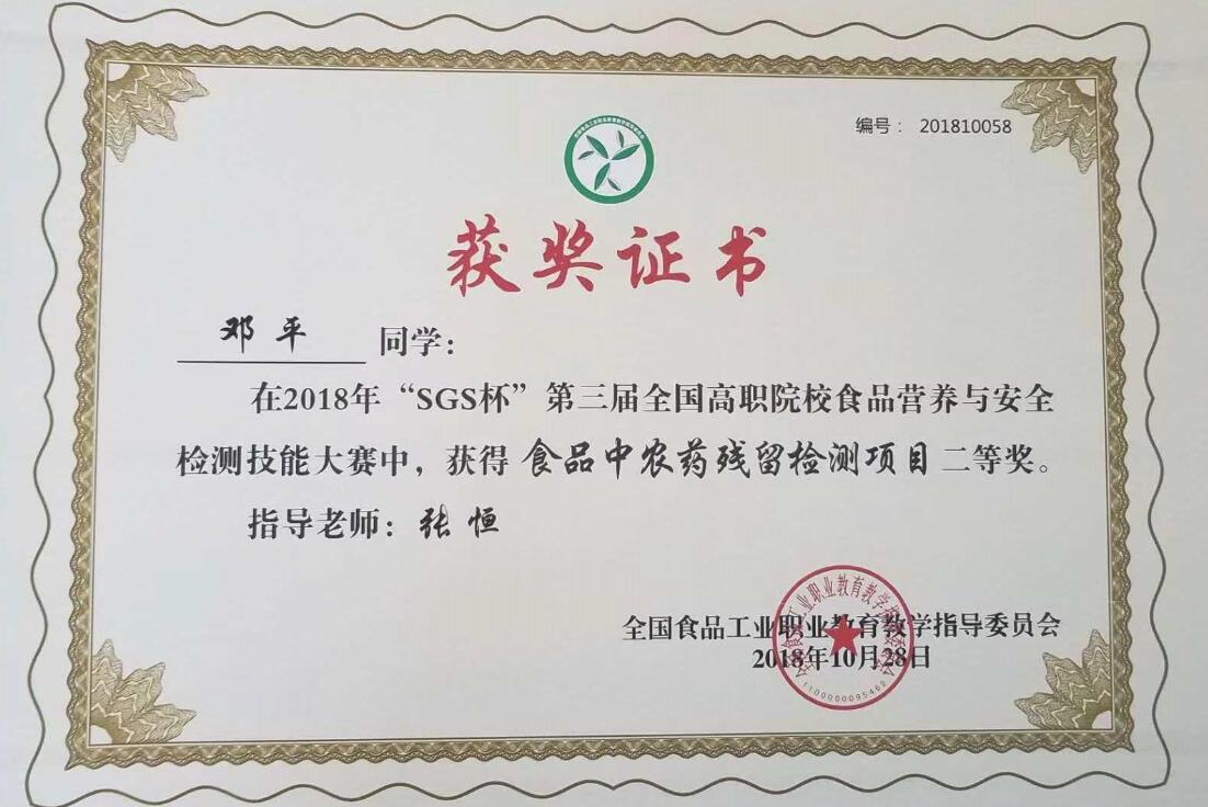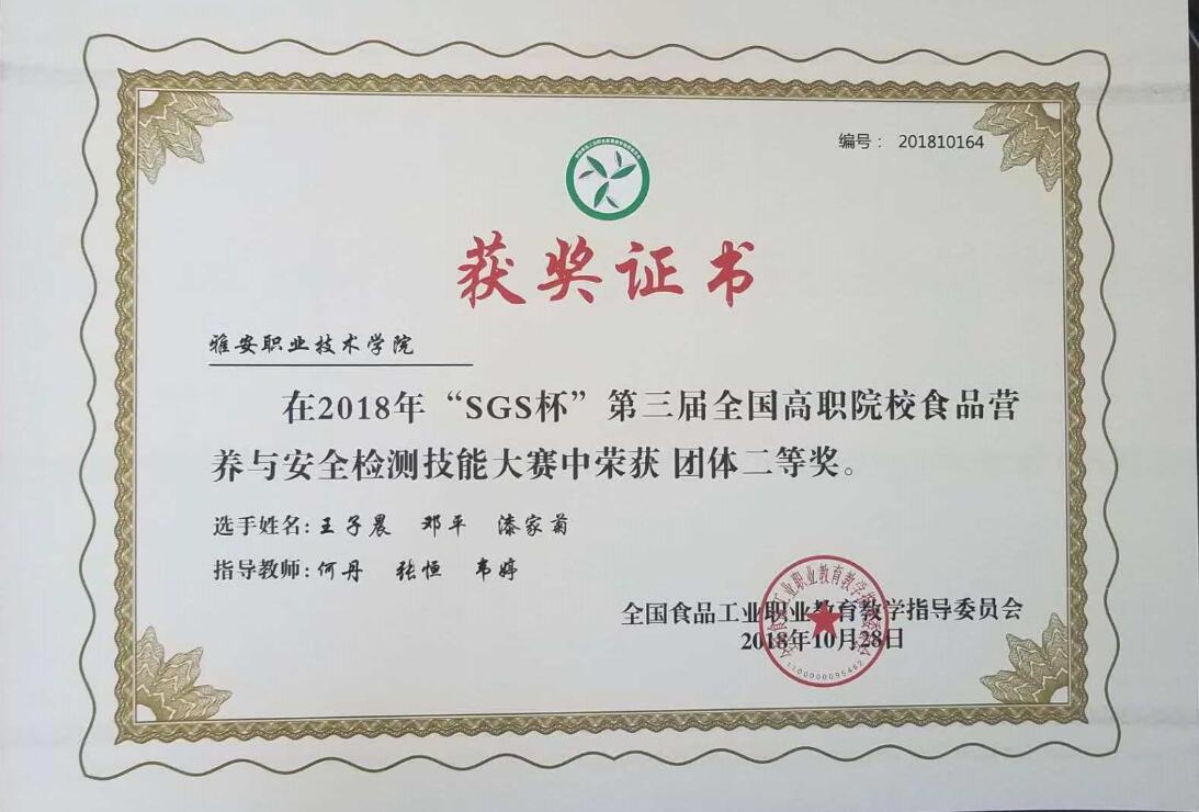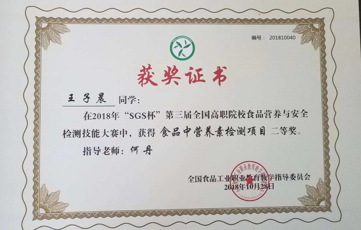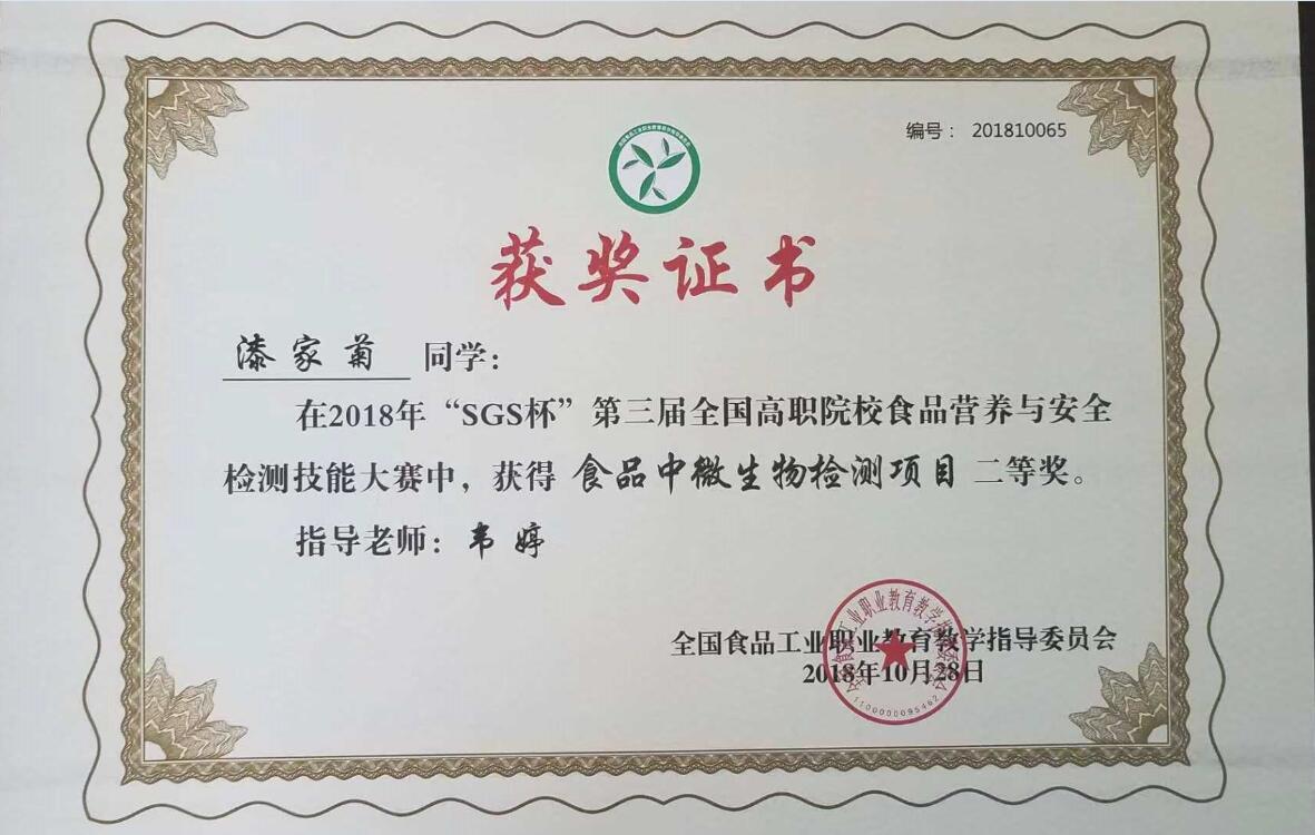【本网讯】10月25日至29日,由全国食品工业职业教育教学指导委员会主办的SGS杯第三届全国食品营养与安全检测高职院校在校生技能大赛,在广东轻工职业技术学院举行。来自全国的80所高等职业院校代表队共240名选手参加了此次比赛。本次大赛设有食品营养素检测、微生物检测、农药残留检测三个赛项,经过现场理化操作、上机测量、数据处理、虚拟仿真软件竞赛等四个环节的激烈角逐,我院食品营养与检测2016-1班王子晨、漆家菊、邓平同学分别获得营养素检测、微生物检测、农药残留检测三个单项二等奖,我院喜获团体二等奖。