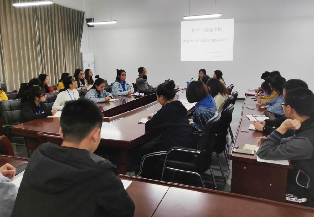 【本网讯】为了预防学生干部队伍的功利化、庸俗化,加强学生干部的工作作风,安排相关工作。10月9日,药检学院团总支学生会全体成员在经开区食品药品生产实训基地205会议室召开了10月份干部例会和学生干部工作作风研讨会。本次会由系团总支书记鲜敏老师主持,团总支副书记陈静老师作补充说明,全体学生会成员参加。