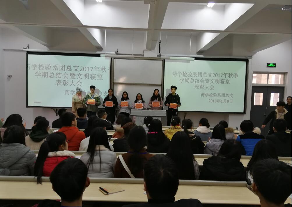 【本网讯】为了总结本学期的工作,加强学生会成员之间的交流与沟通,了解、纠正工作中的错误和不足,更好地开展今后工作,1月9日,药检系团总支组织学生会干部干事在实训与服务中心1104教室召开了2017年秋季学期总结会暨文明寝室表彰大会。团总支书记鲜敏、副书记陈静及所有新老干部、干事、寝室代表共计200余人参会。会议由鲜敏主持。