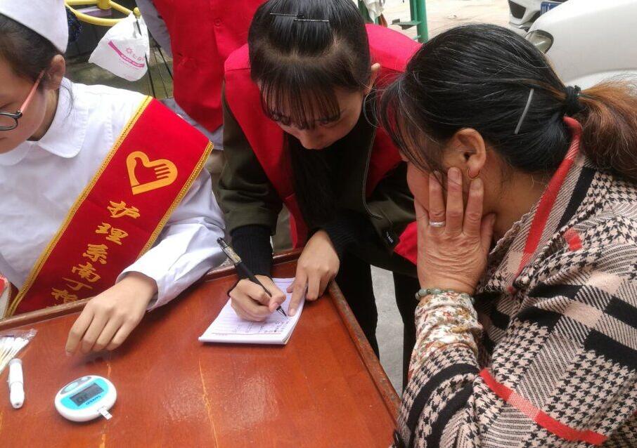 活动进行时,志愿者们迅速投入工作状态,小区居民也热烈响应,义诊活动有序开展。测量血压、血糖前,志愿者们仔细地询问了居民们的姓名和年龄,以便更好地结合居民身体状况做出准确的诊断。此外,志愿者也对血糖血压数据进行了认真详细的记录,并告诉居民们如何有效改正生活中不良的饮食习惯。