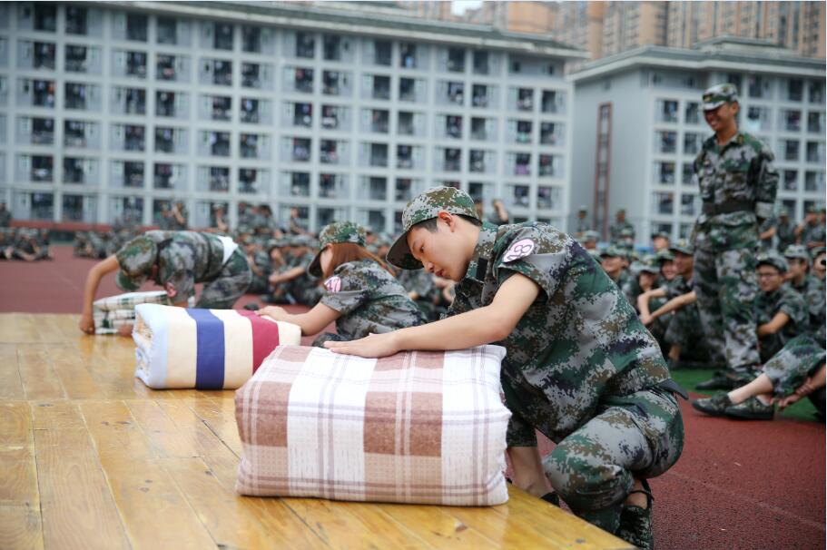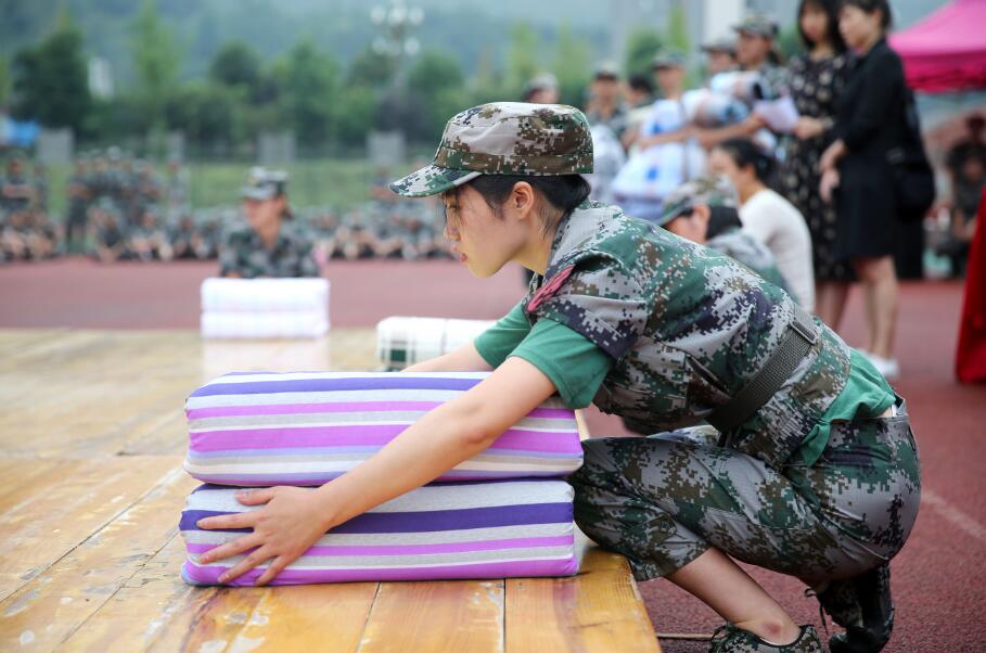 本次大赛以参训方阵为单位,通过初赛择优推荐四名学生参加决赛,随着一轮轮开始的哨声,参赛选手迅速行动使出铺平、压实、翻折、抠角、捏线等绝招,短短的5分钟,一床床整齐的“豆腐块”被子便呈现在训练场上。学院2017级新生将公寓“床铺”搬到了训练场上,热火朝天的比赛场面、整齐的豆腐块,将成为新生公寓生活难忘的风景线。