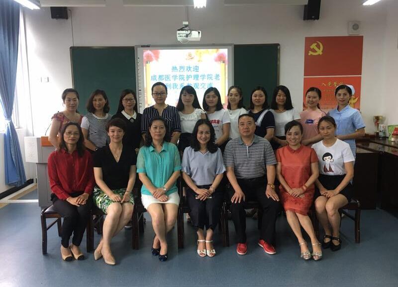 【本网讯】2017年7月6日下午,成都医学院护理学院一行8人在书记刘群峰、院长赵小玉、副院长曾兢等领导的陪同下来到我院护理系参观交流,系主任王静,教研室主任陈俊及护理系教师热情接待。