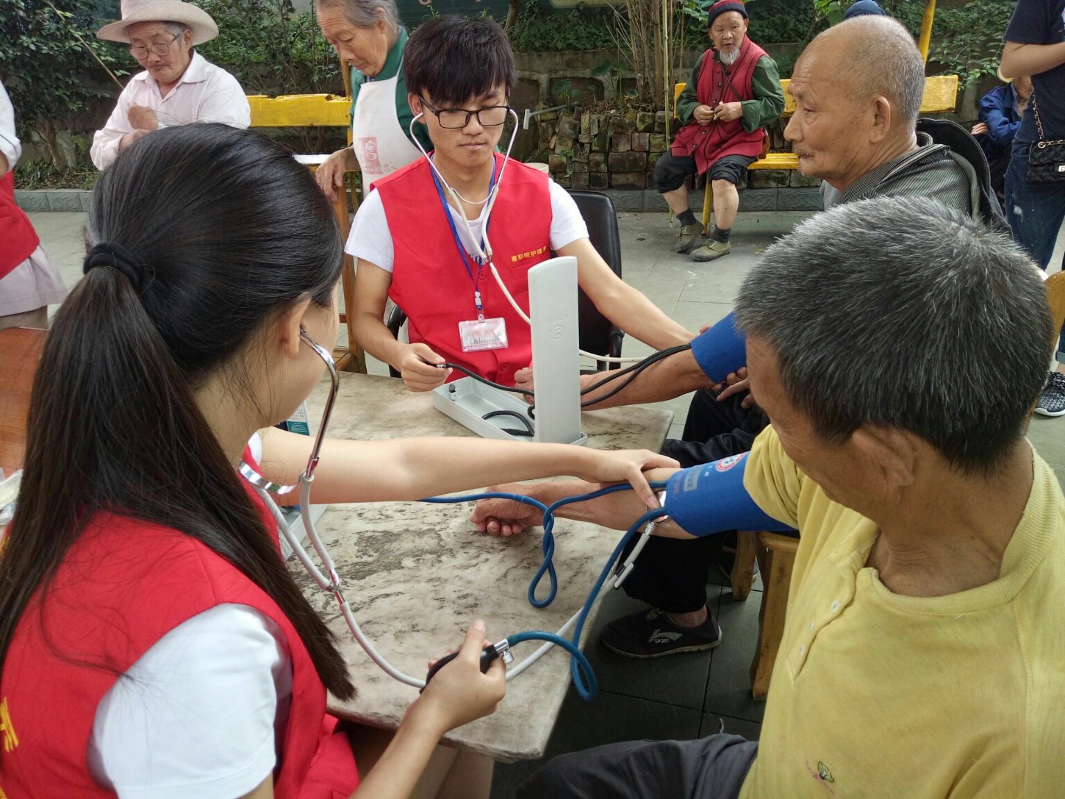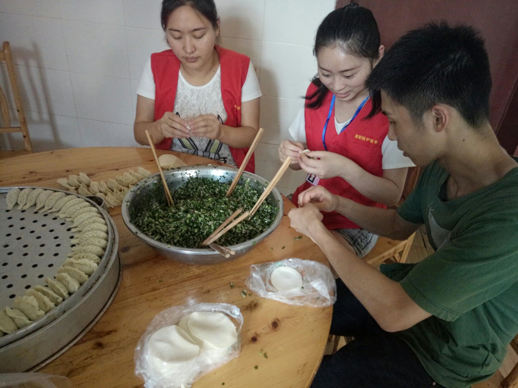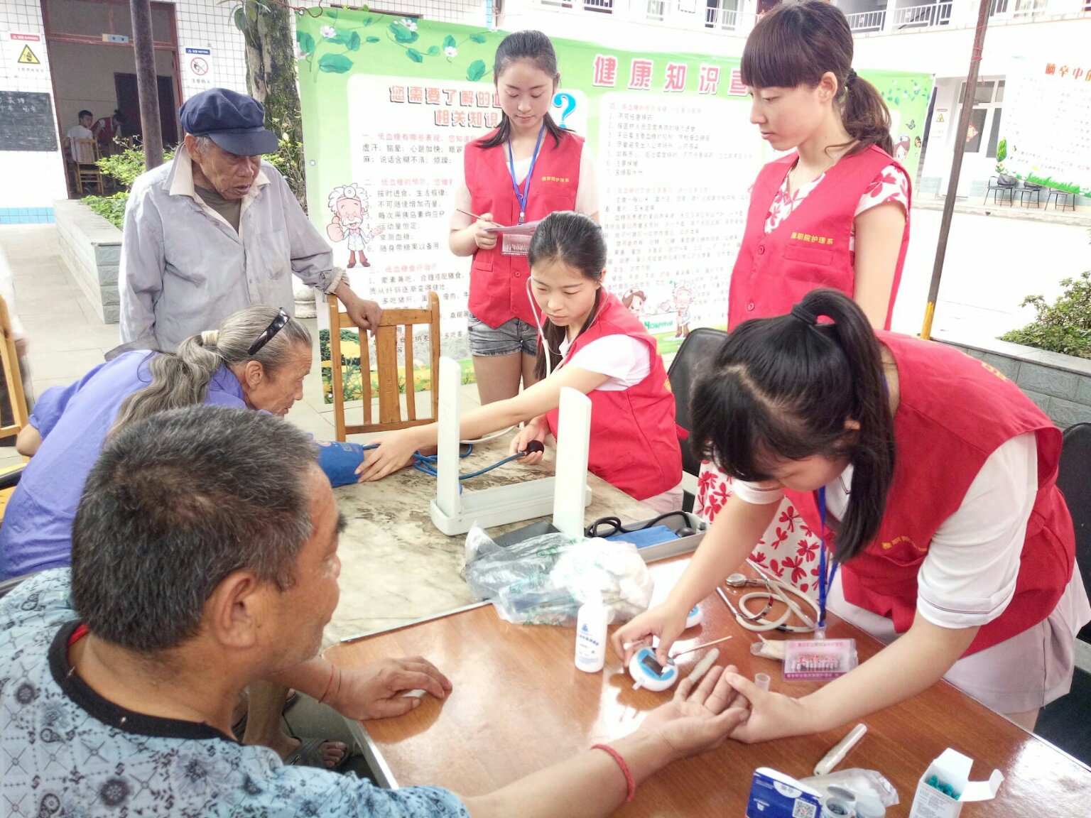 一大早,志愿者们就带着采购好的新鲜水果和蔬菜直奔敬老院。在敬老院院坝里,党员教师和同学们与近20位老人围坐一起,一对一地为他们测血压、测血糖、做健康宣教、聊家常。同学们还献上了精心准备的歌唱节目和舞蹈节目。老人们边吃西瓜边看节目,脸上洋溢着幸福的笑容。最后,师生们一起包饺子,为老人送上了爱心午餐。