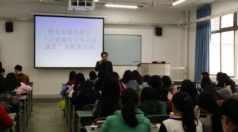 【本网讯】为了促进教育系志愿服务工作水平的不断提高,4月5日下午,教育系团总支特别邀请到雅安市儒扬教育的负责人高阳老师来院为志愿者们开展了以“关爱留守学生心灵成长”为主题的培训讲座。教育系100余名志愿者聆听了讲座。