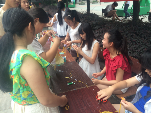 来自教育系2014级学前教育专业与手工协会的16名同学现场DIY,积极发挥创意,将各种材料,如茶叶、花朵、香料等包裹在香囊中,制作出一个个形状各异的香囊,悬挂在树枝上。活动吸引了许多往来同学的围观,部分同学还主动加入到制作团队中边学边做,兴致高昂。