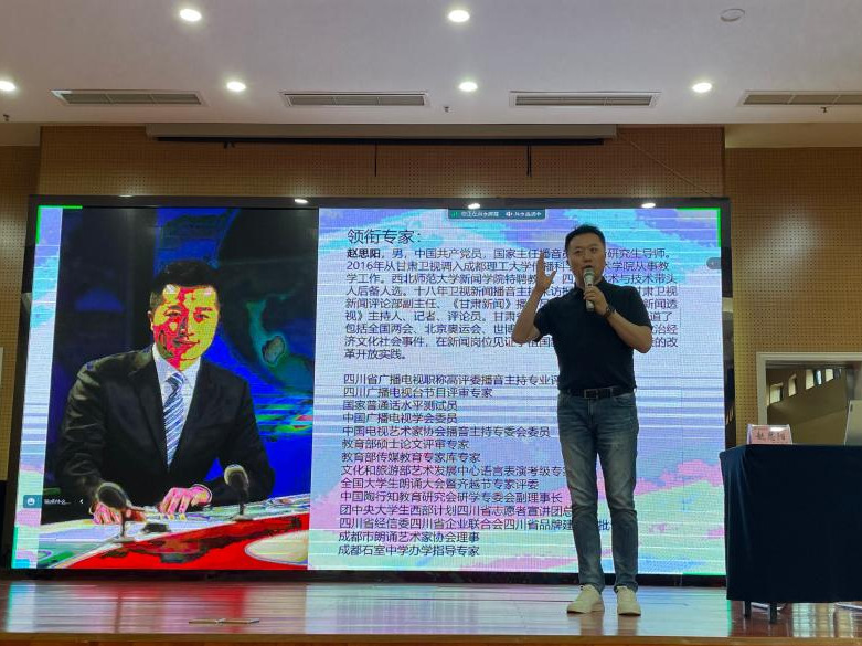为传承弘扬以语言文字为载体的中华优秀传统文化,提升国家通用语言文字普及程度和普及质量,5月16日,师范学院邀请国家主任播音员、成都理工大学教授、硕士研究生导师、西北师范大学新闻学院特邀教授赵思阳作为主讲人,在青年路校区学府花园博雅厅开展题为“口才造就人生”普通话提升讲座。本次讲座采用线上线下同步开展的形式,共有200余名学生参加。