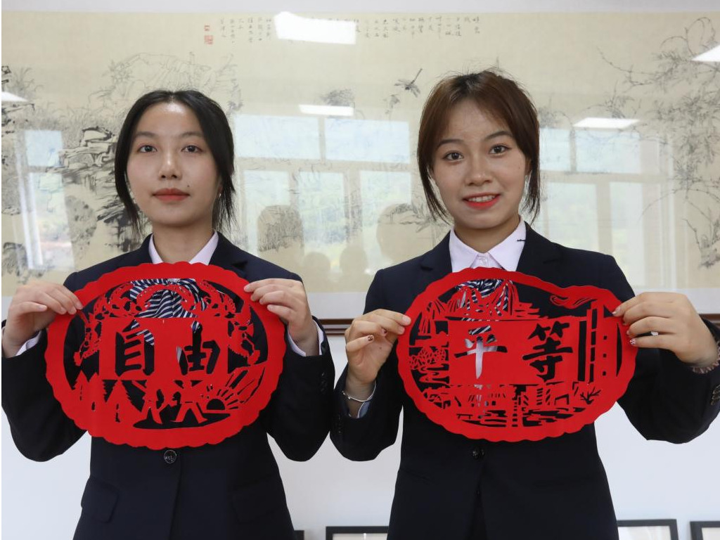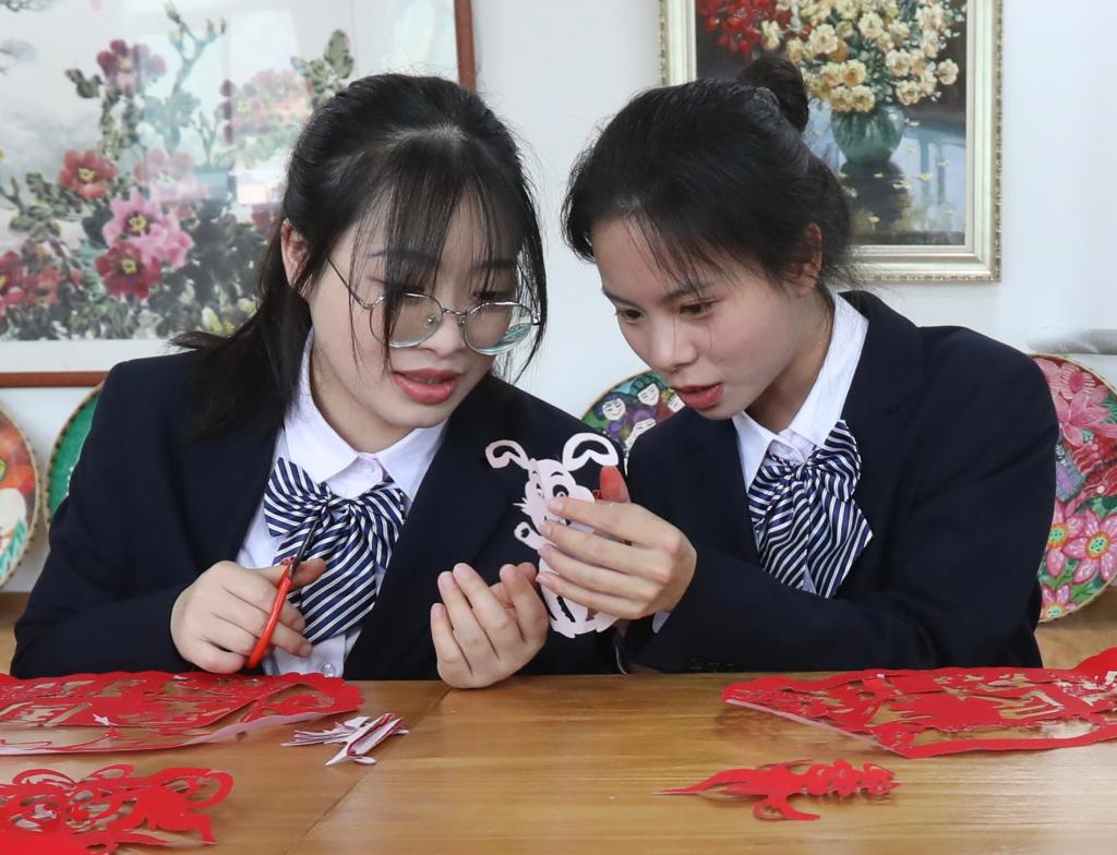 学生在郭靓薇的带领下运用剪纸技术剪出了社会主义核心价值观、剪纸披肩和窗花等各类手工艺术品,学生手法略显生疏但积极性高涨。