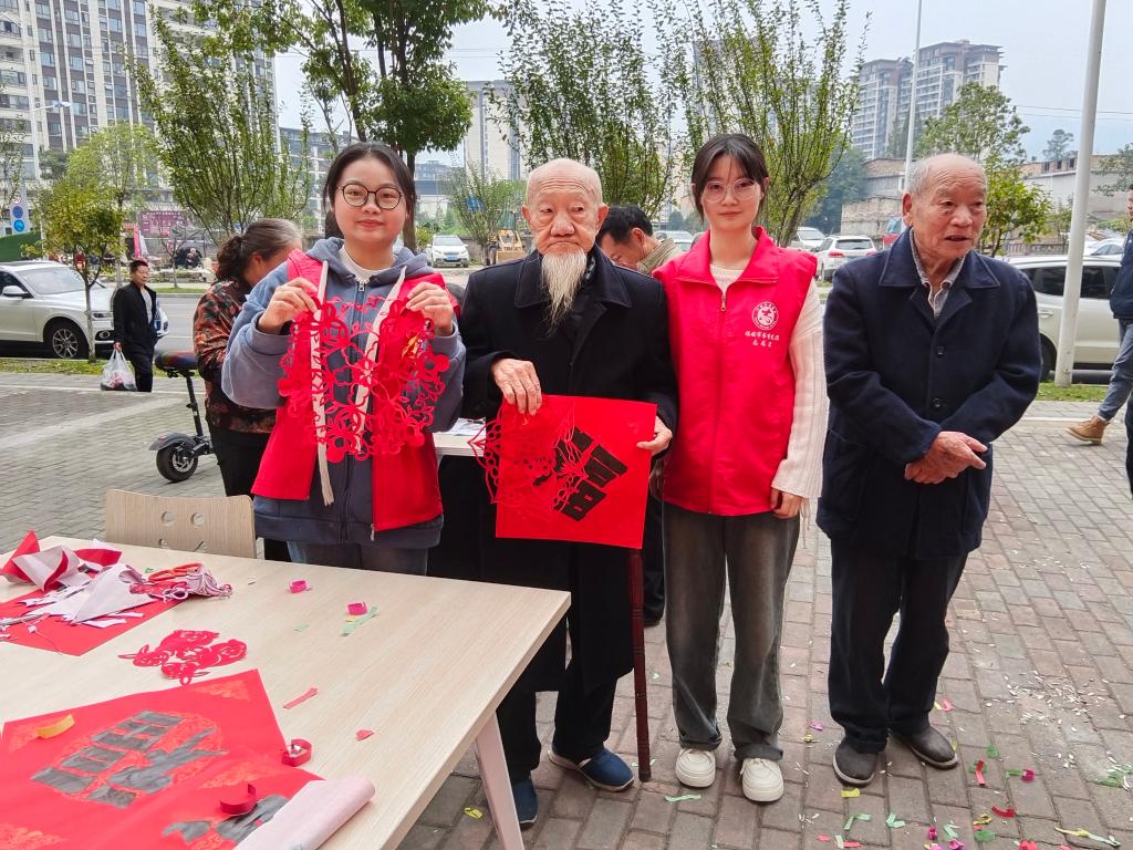 学生志愿者发挥专业所长和爷爷奶奶们一道写“福”送“寿”,画吉祥牡丹图,剪红火的窗花,现场人员涌动,欢声笑语不断,为重阳节增添了浓厚的欢乐气氛。